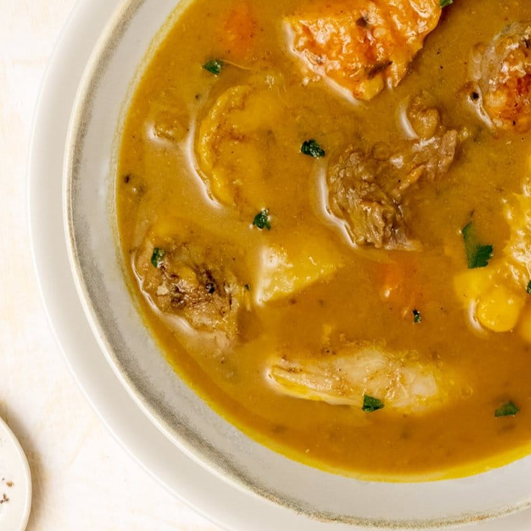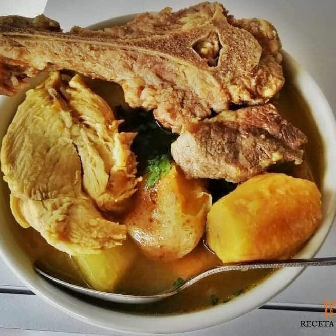 Sancocho mixto con espinazo de cerdo y morrillo de res, arroz, ensalada, aguacate o banano, limón, arepa y jugo del día.
