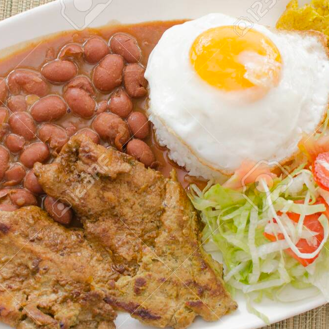 Arroz, tilapia frita, ensalada, patacones, limón, sopa o frijol a elección y jugo a elegir.