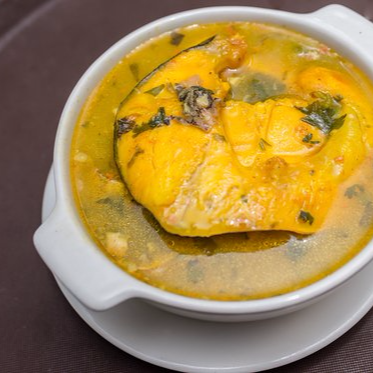 Porción de sopa de pescado en contenedor de 16 oz más porción de arroz con ensalada, arepa, limón y jugo del día, no lleva proteína es decir que no lleva porción de pescado.