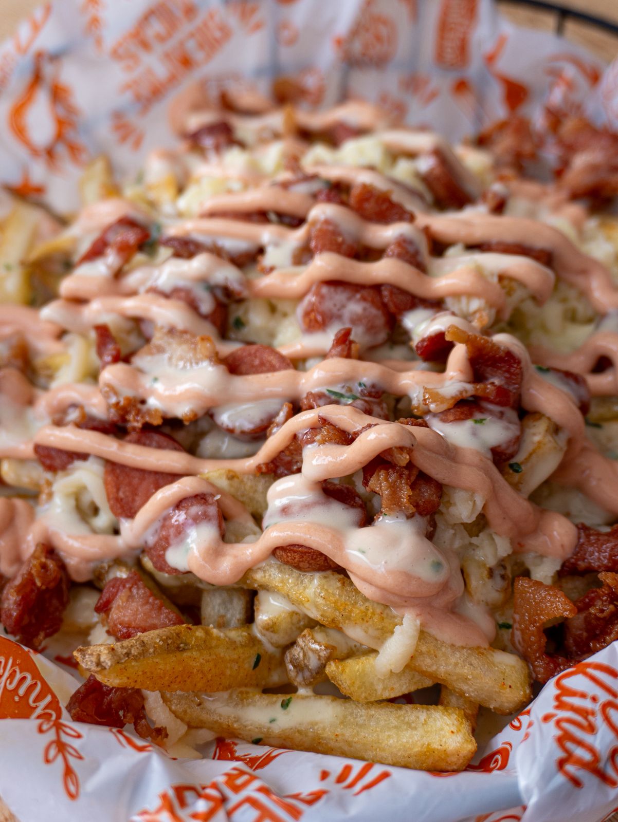 Crujientes papas a la francesa , queso mozarella , salchicha , tocineta , salsas: rosada , bbq y salsa base