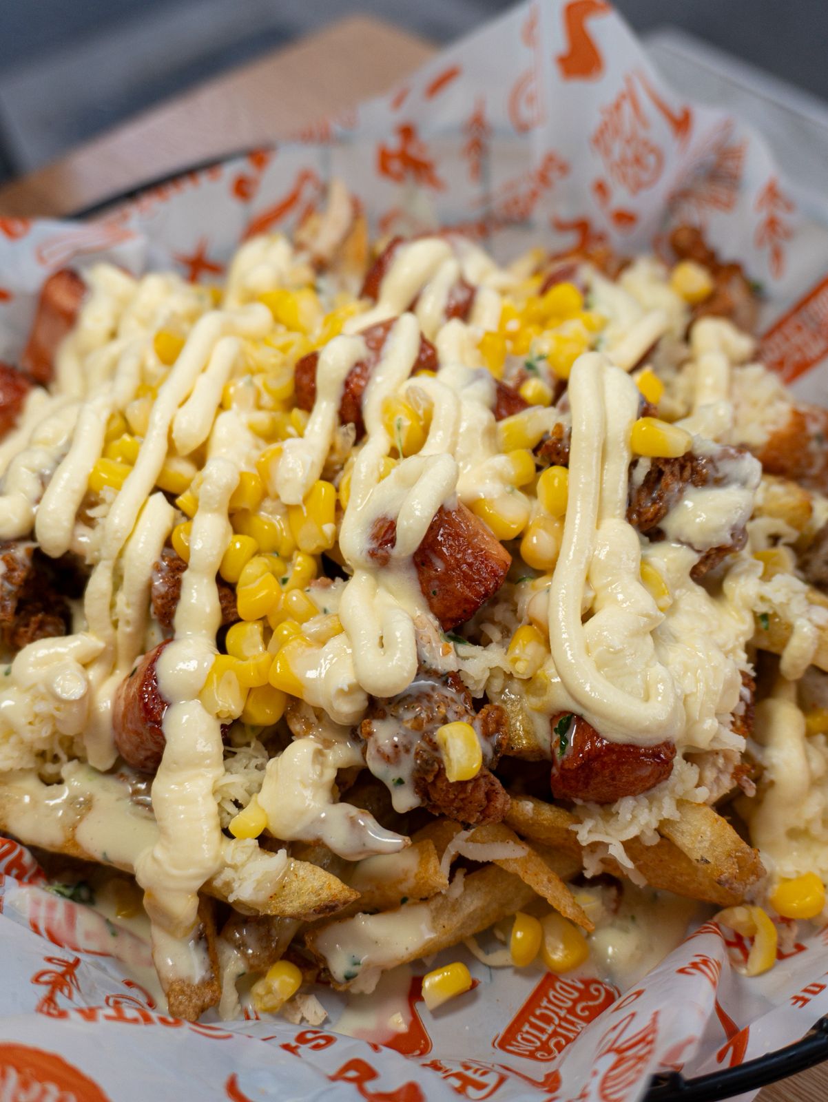 Crujientes papas a la francesa, pollo apanado, Salchicha ranchera, queso mozzarella, maicitos, sour cream y salsa base