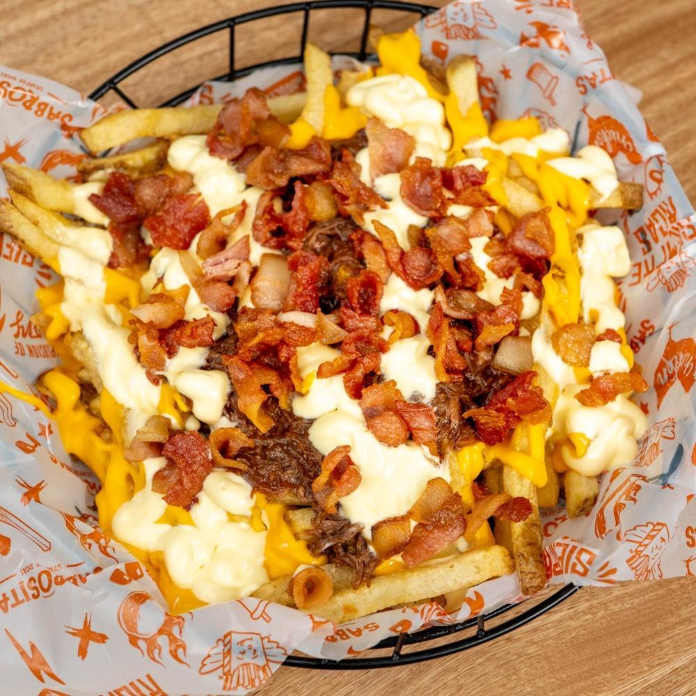 Crujientes papas a la francesa, cheddar, sour cream , carne desmechada en salsa BBQ Jack Daniels y tocineta