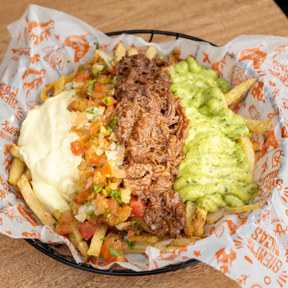 Crujientes papas a la francesa, carne desmechada en salsa BBQ Jack Daniels , pico de gallo, sour cream, guacamole de la casa y salsa base