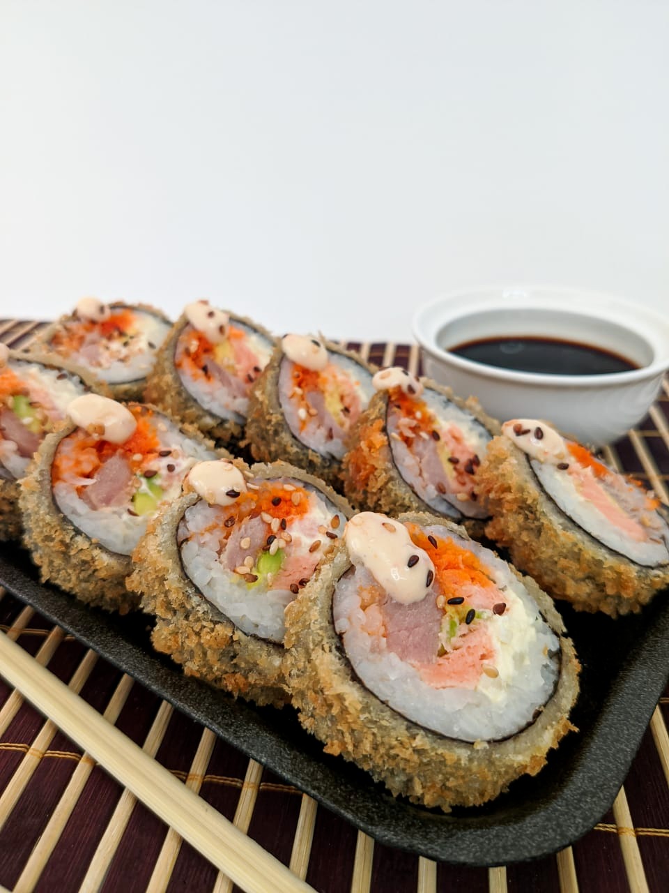 10 Roll apanados, rellenos de camarón, kani tempura, aguacate, ajonjolí y salsa fuji.