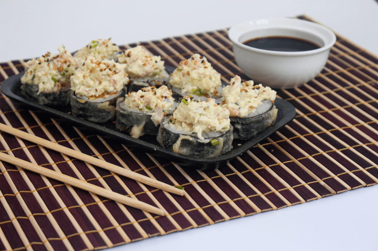 10 Roll rellenos de salmón tempura, vegetales, queso crema, con tope de salsa vulcano gratinado.