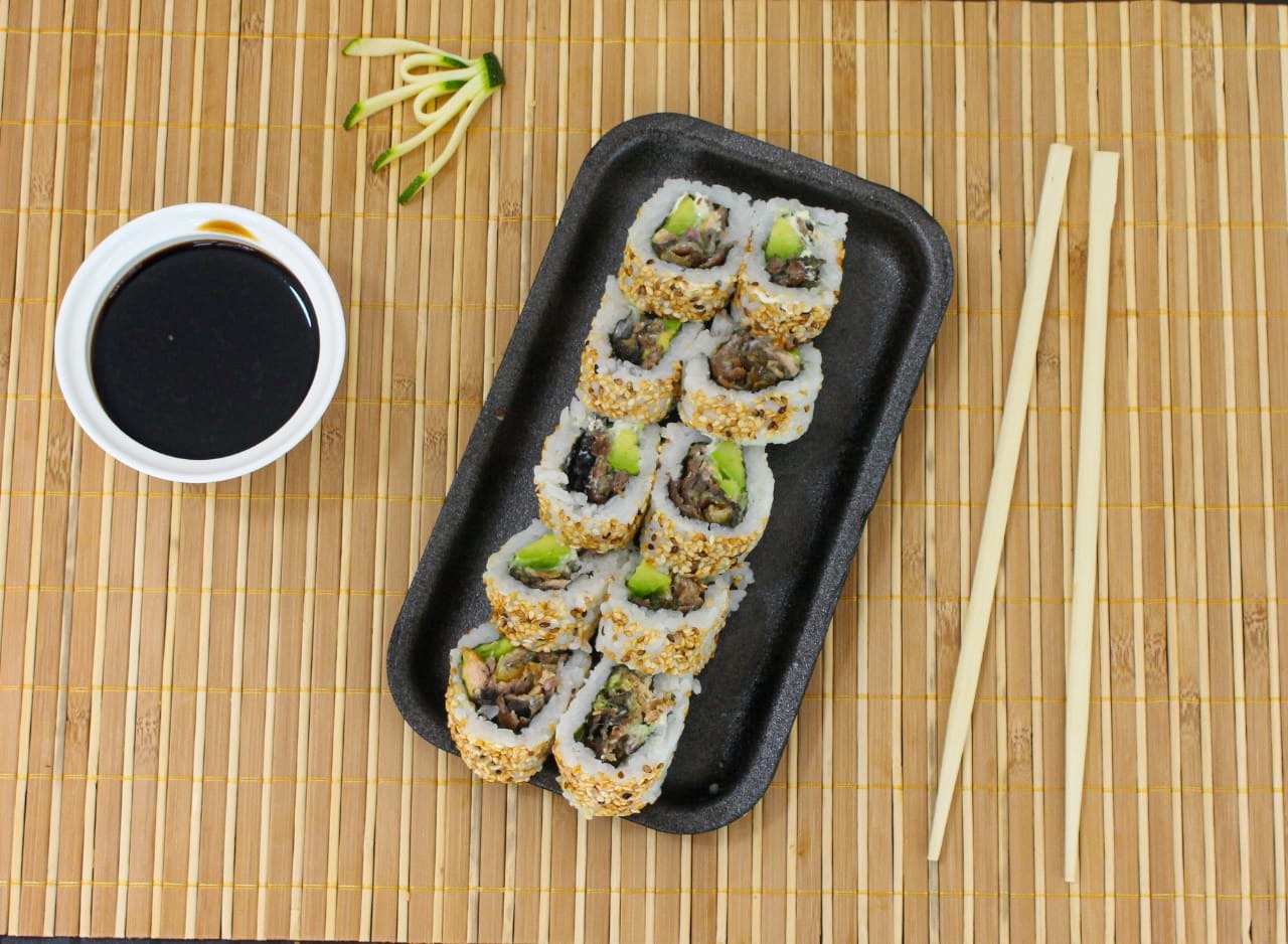 10 Roll rellenos de pescado blanco, aguacate y queso crema.