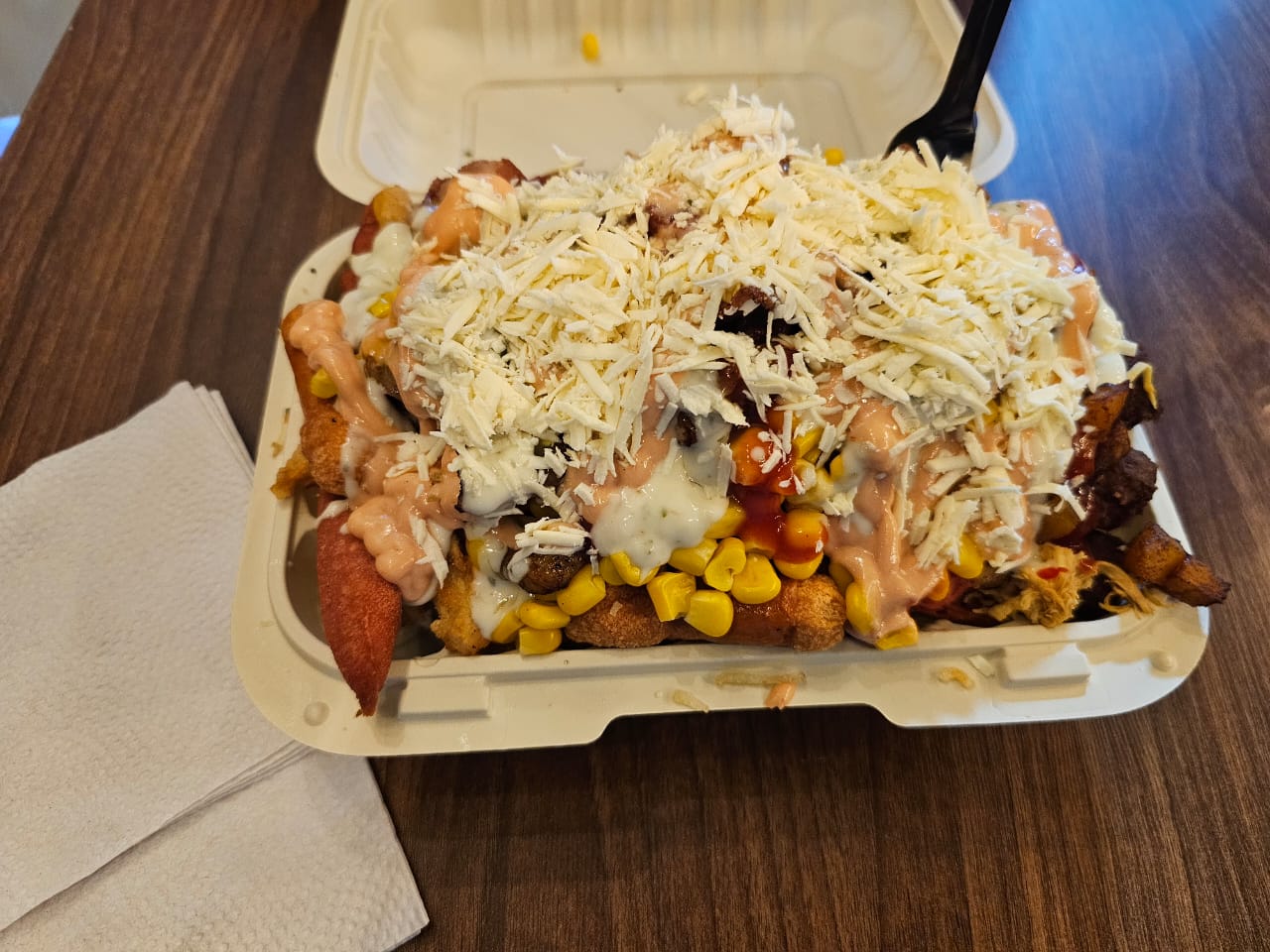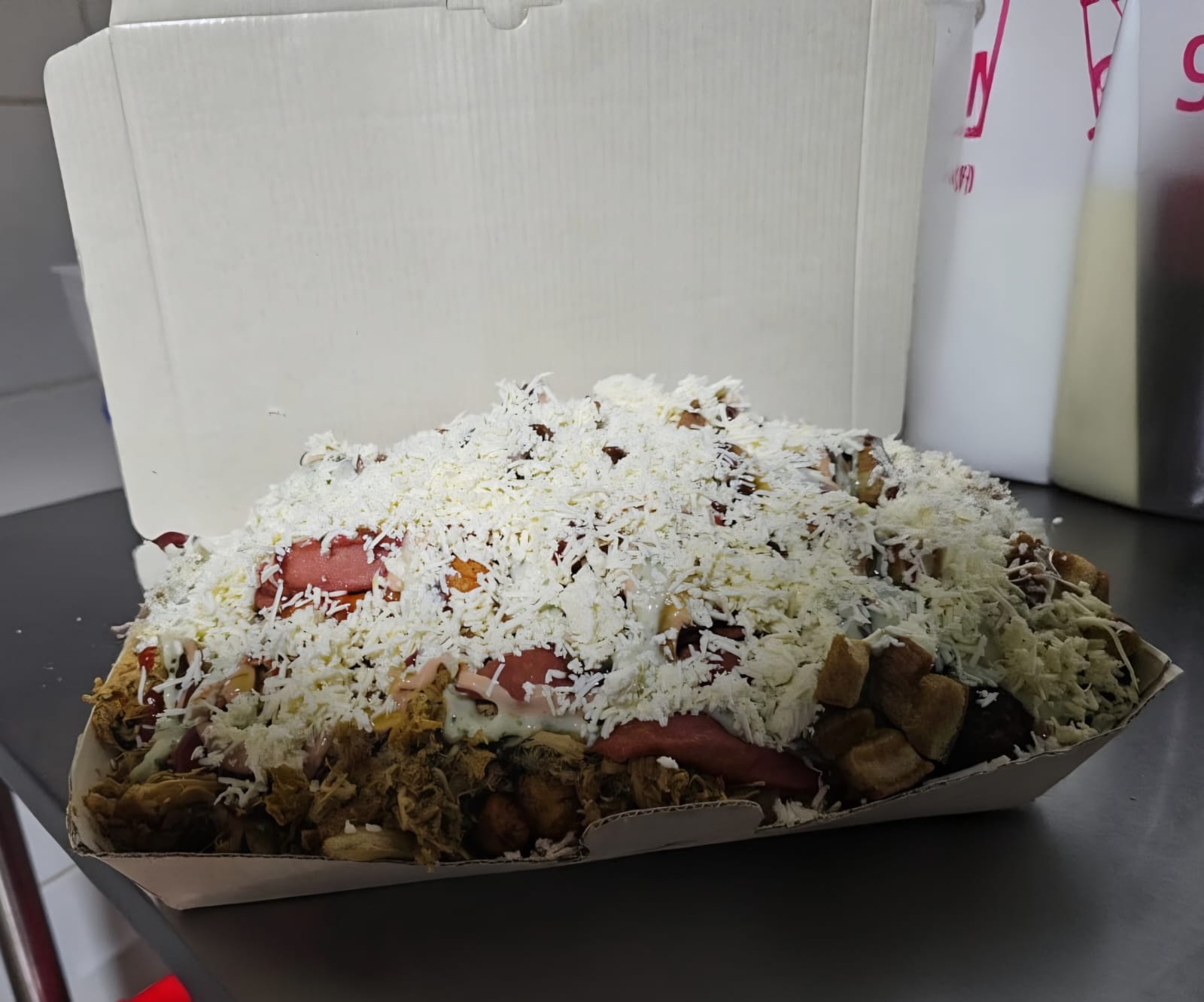 Papas, salchichas, tocineta, pollo desmechado, maicitos, ripio de papas y queso costeño.