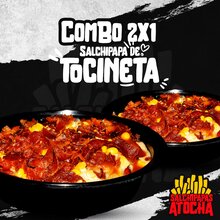 2 deliciosas salchipapas individuales, de aproximadamente 300 g cada una, preparadas con papas a la francesa, salchichas, butifarra picada, ripio, tocineta, queso costeño, tomate y lechuga. Acompañadas de salsas de la casa: tomate, BBQ y ajo.