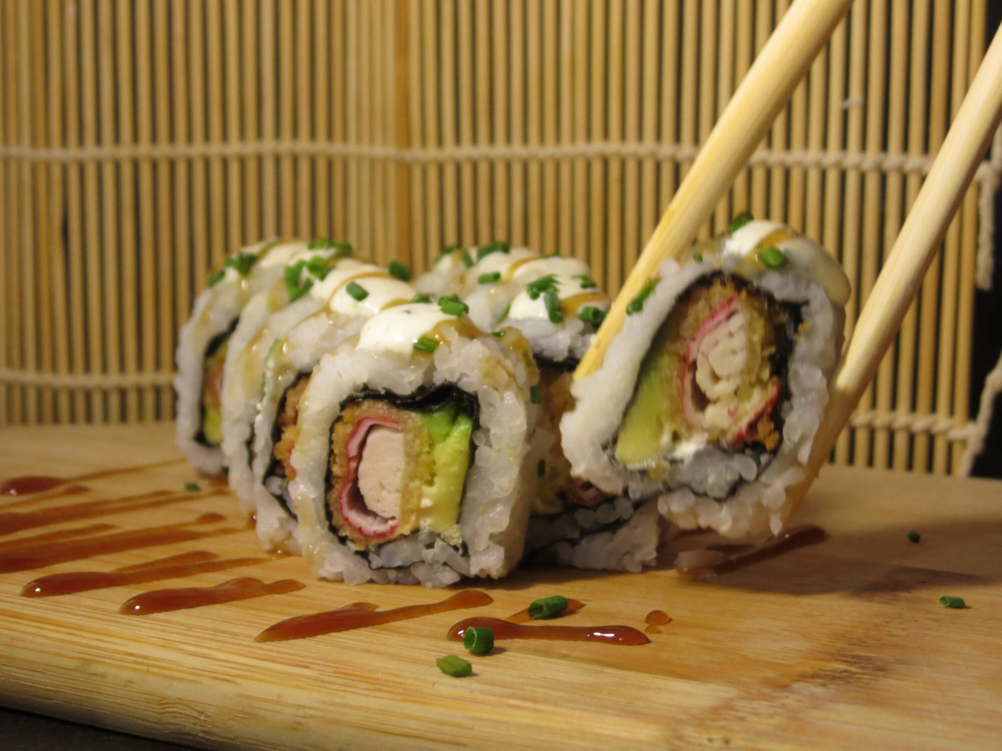 10 deliciosos bocados de sushi crudo, rellenos de pescado basa tempurizado, con aguacate, queso crema, con topping de camarones en salsa Fuji y cebollín.