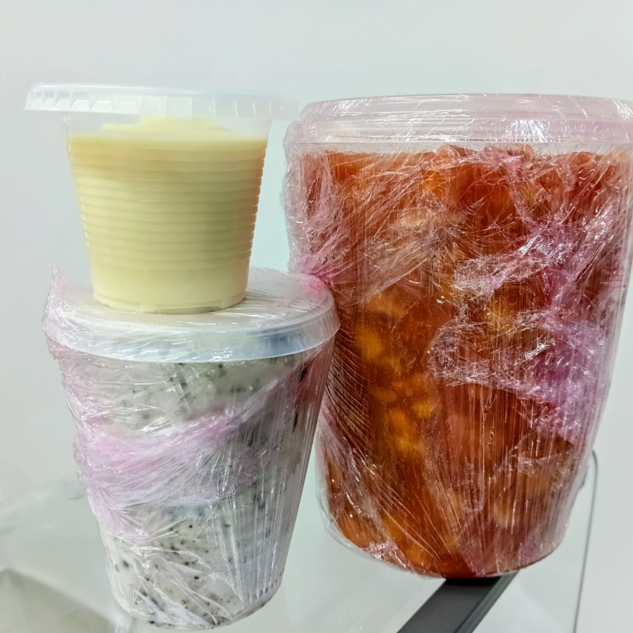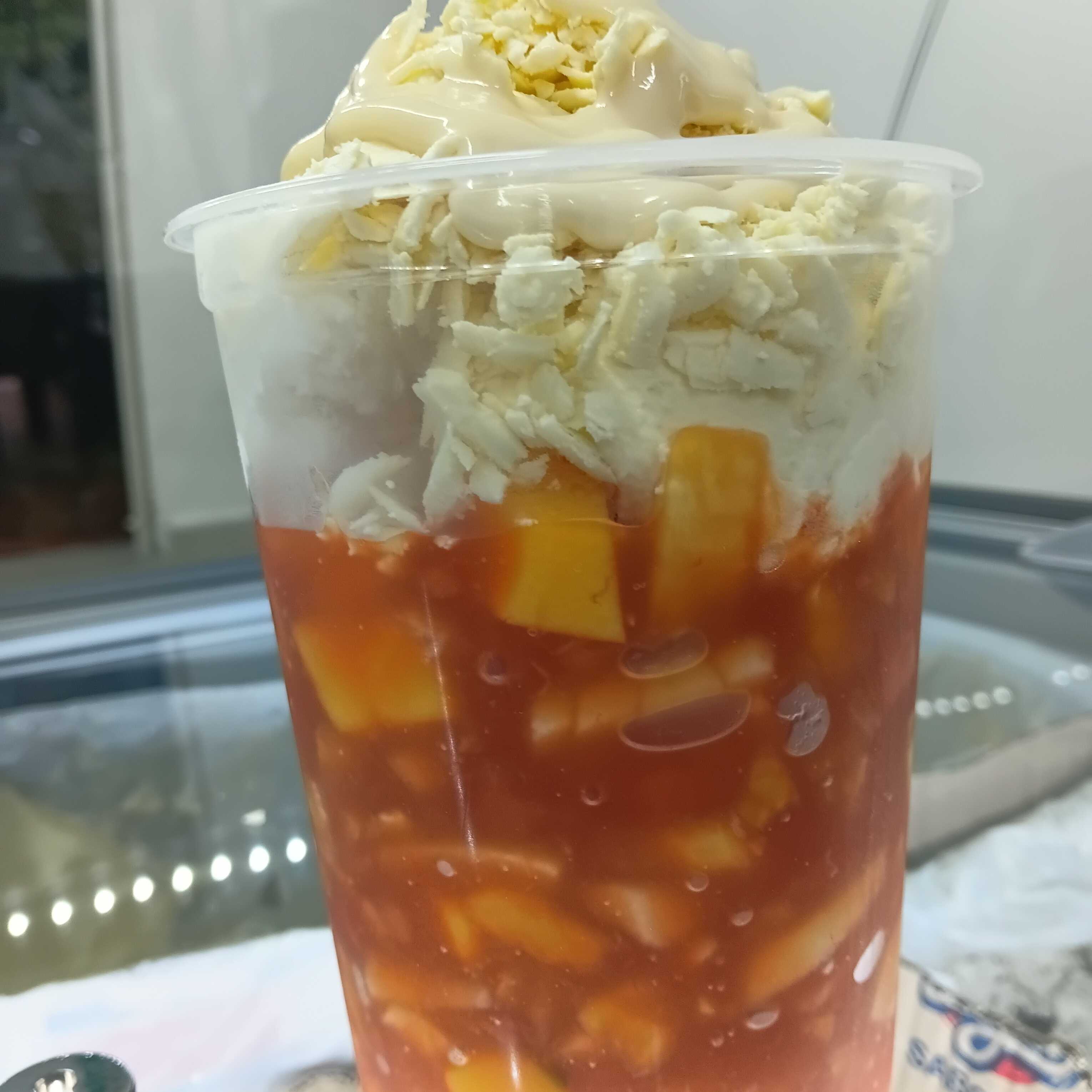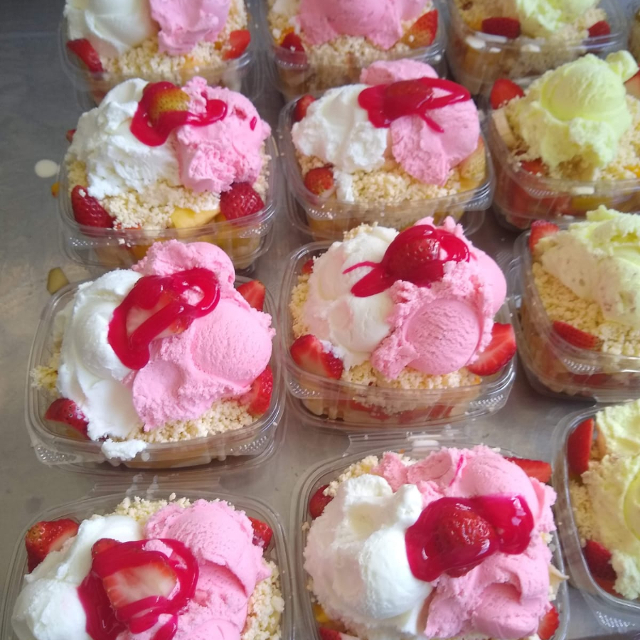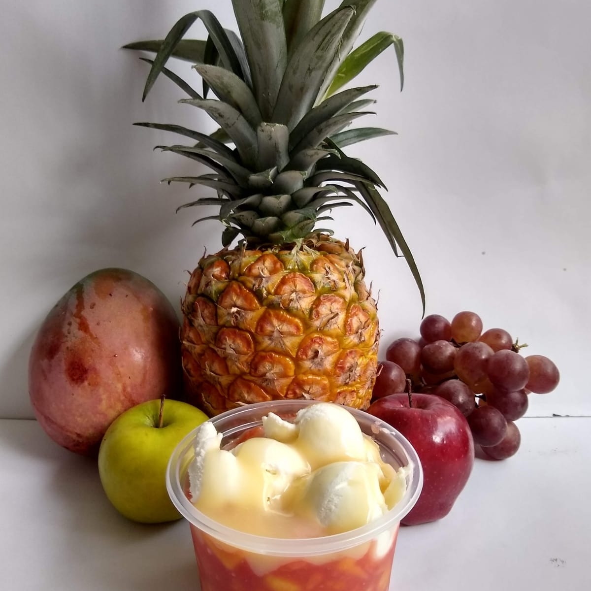 combinacion de deliciosas frutas naturales con 3 bolas de helado, queso rayado,crema de leche, leche condensada y mermelada de mora en recipiente de 32 onzas