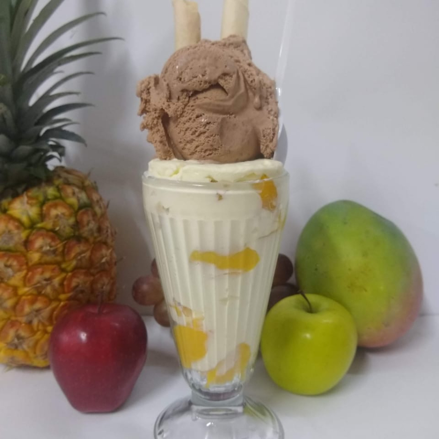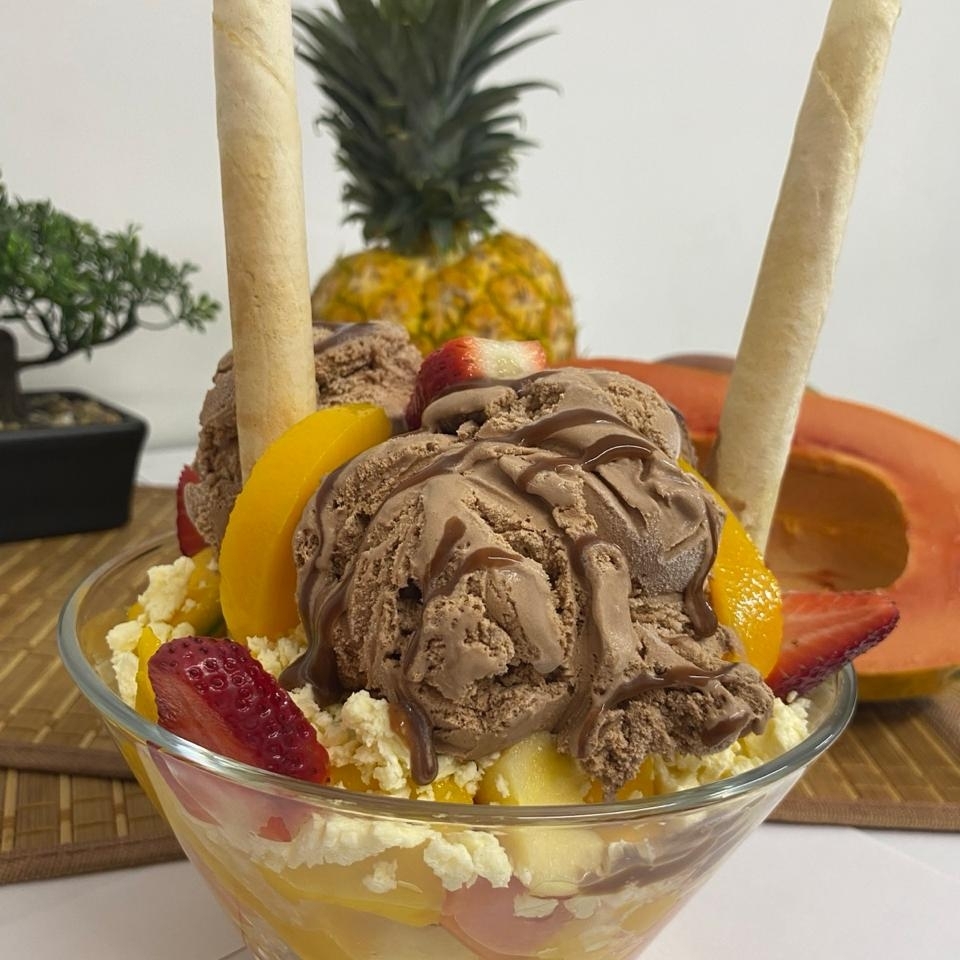 Deliciosa combinacion de frutas acompañado de 3 bolas de helado, queso rayado, crema chantilly y leche condensadahe