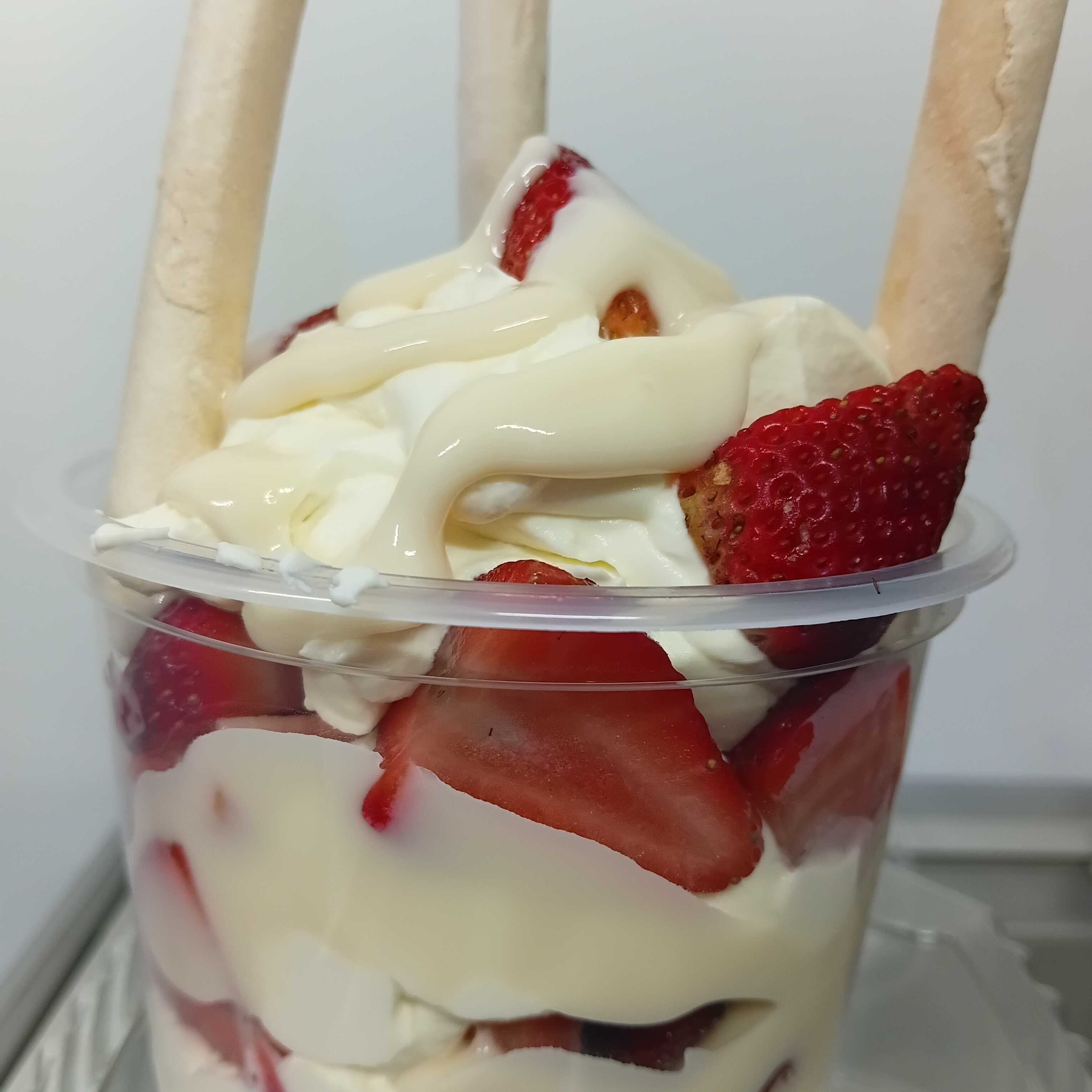 Deliciosas fresas, con crema chantilly,1 bola de helado,leche condensada y galletas, en recipiente de 16 onzas
