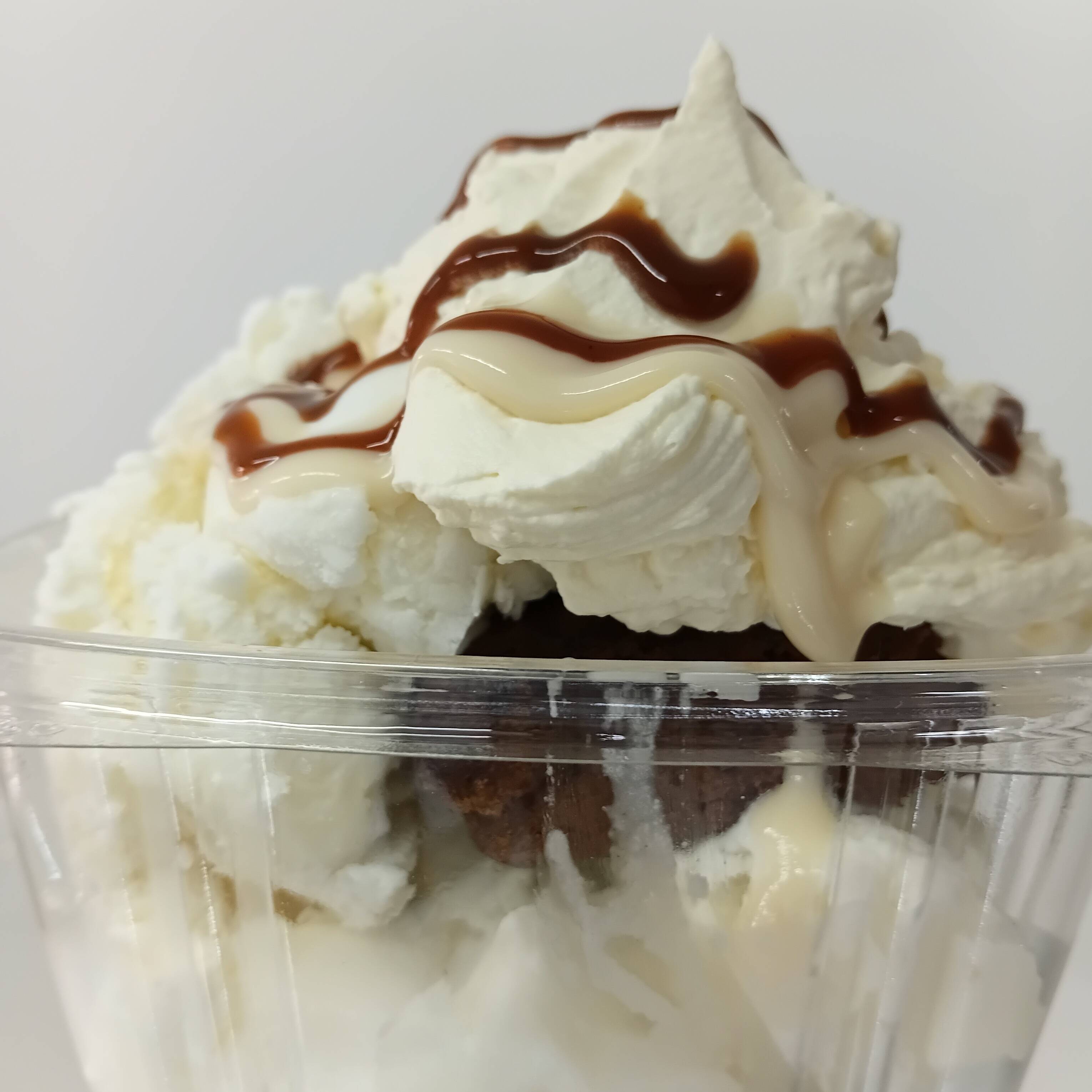 Deliciosa Torta de Brownie, Acompañada de crema chantilly, 3 bolas de helado leche condensada y salsa de chocolate en recipiente de 16 onzas