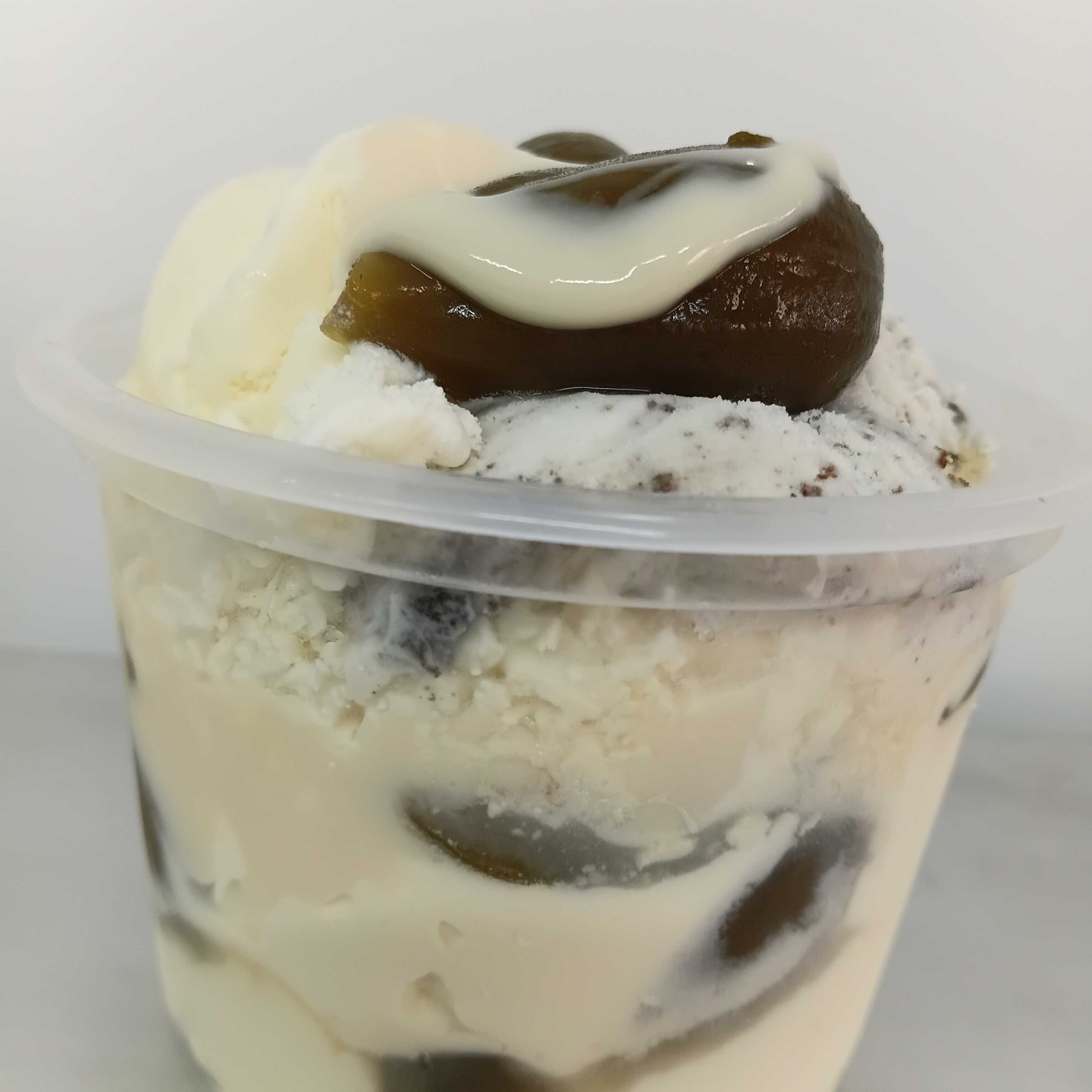 Deliciosas Brevas, con crema chantilly, 1 bola de helado leche condensada en recipiente de 16 onzas
