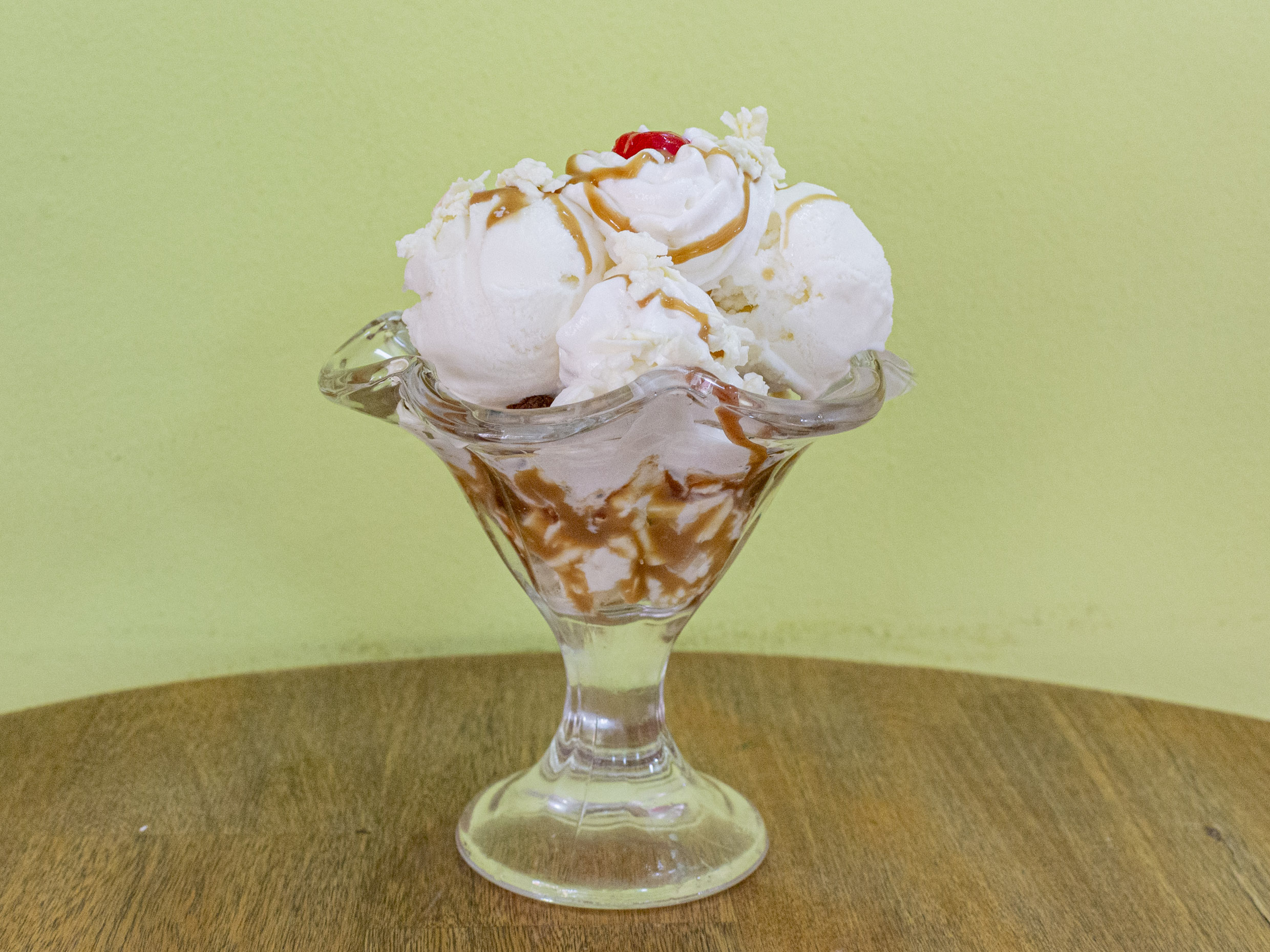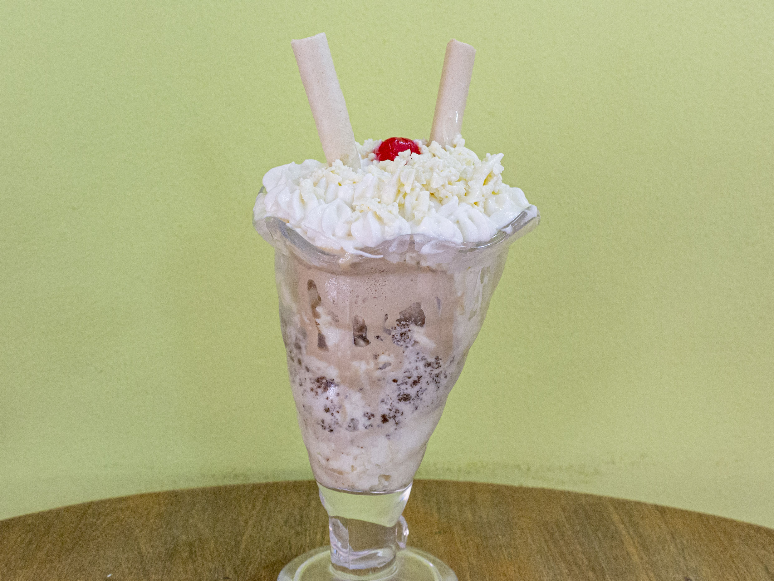 Queso rallado, doble helado,crema de la casa chantilly cereza.