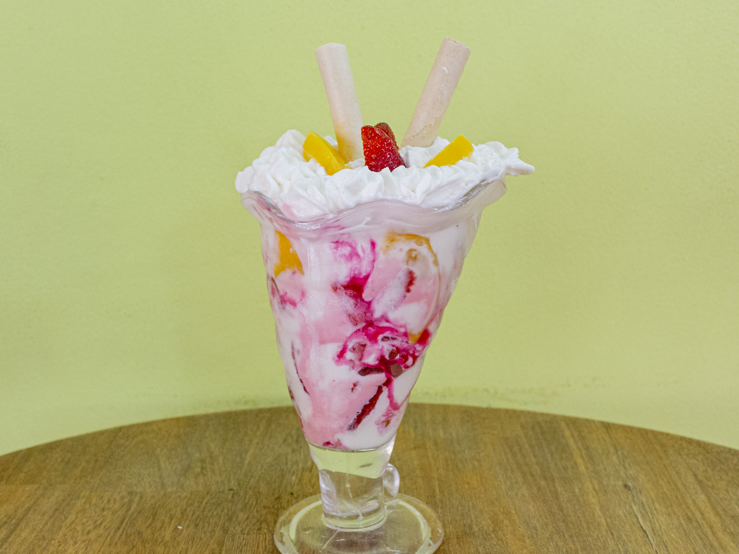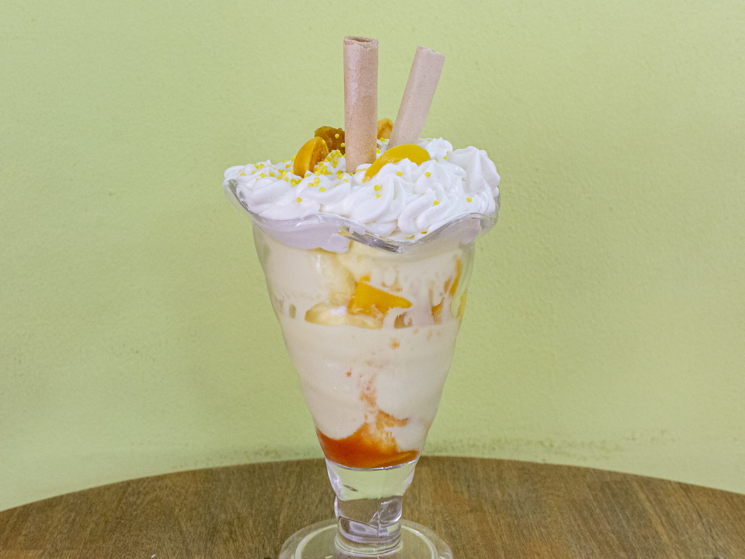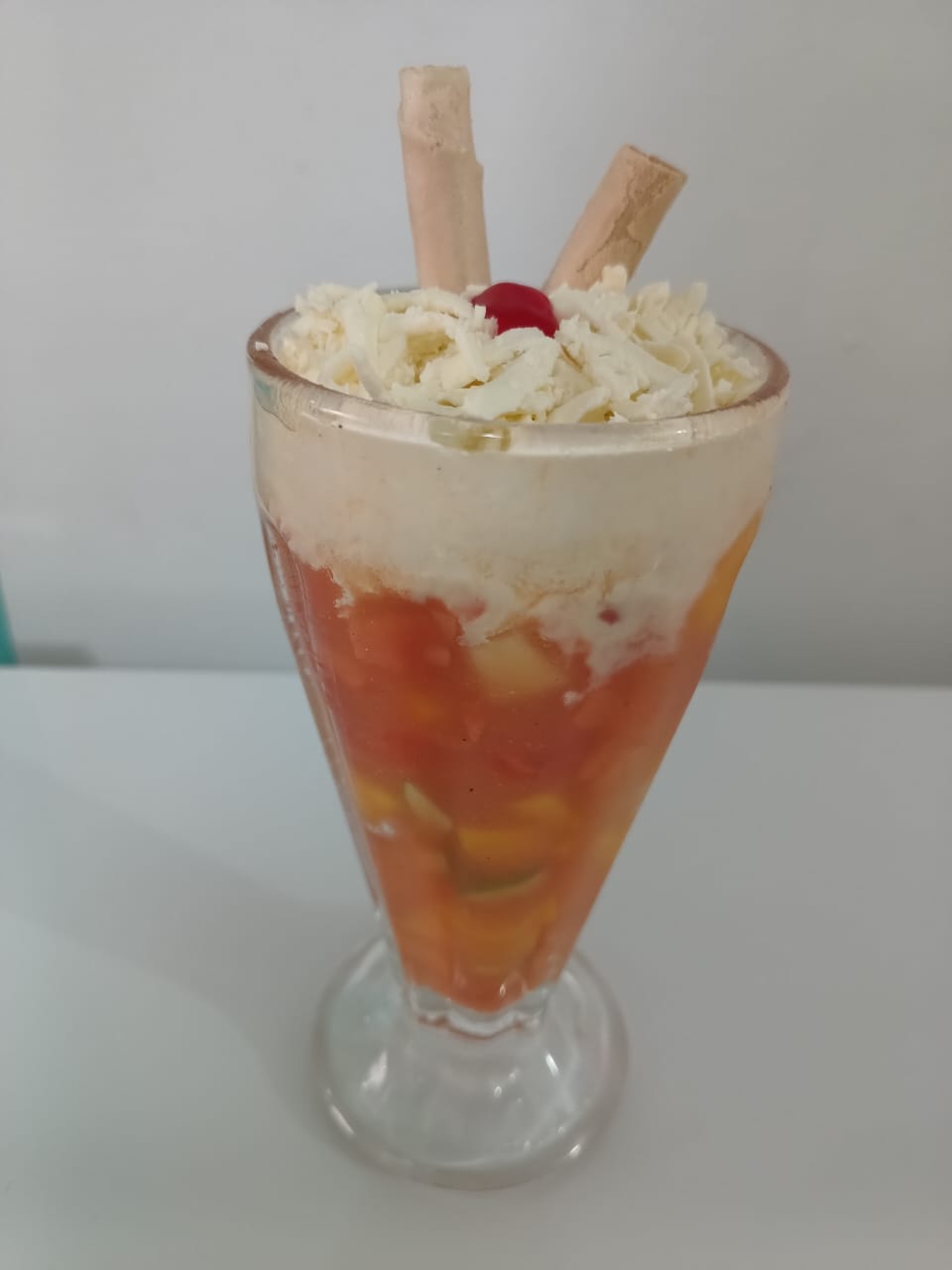 doble helado de maracuya y vainilla crema de la casa piña calada durazno mango y chantilly