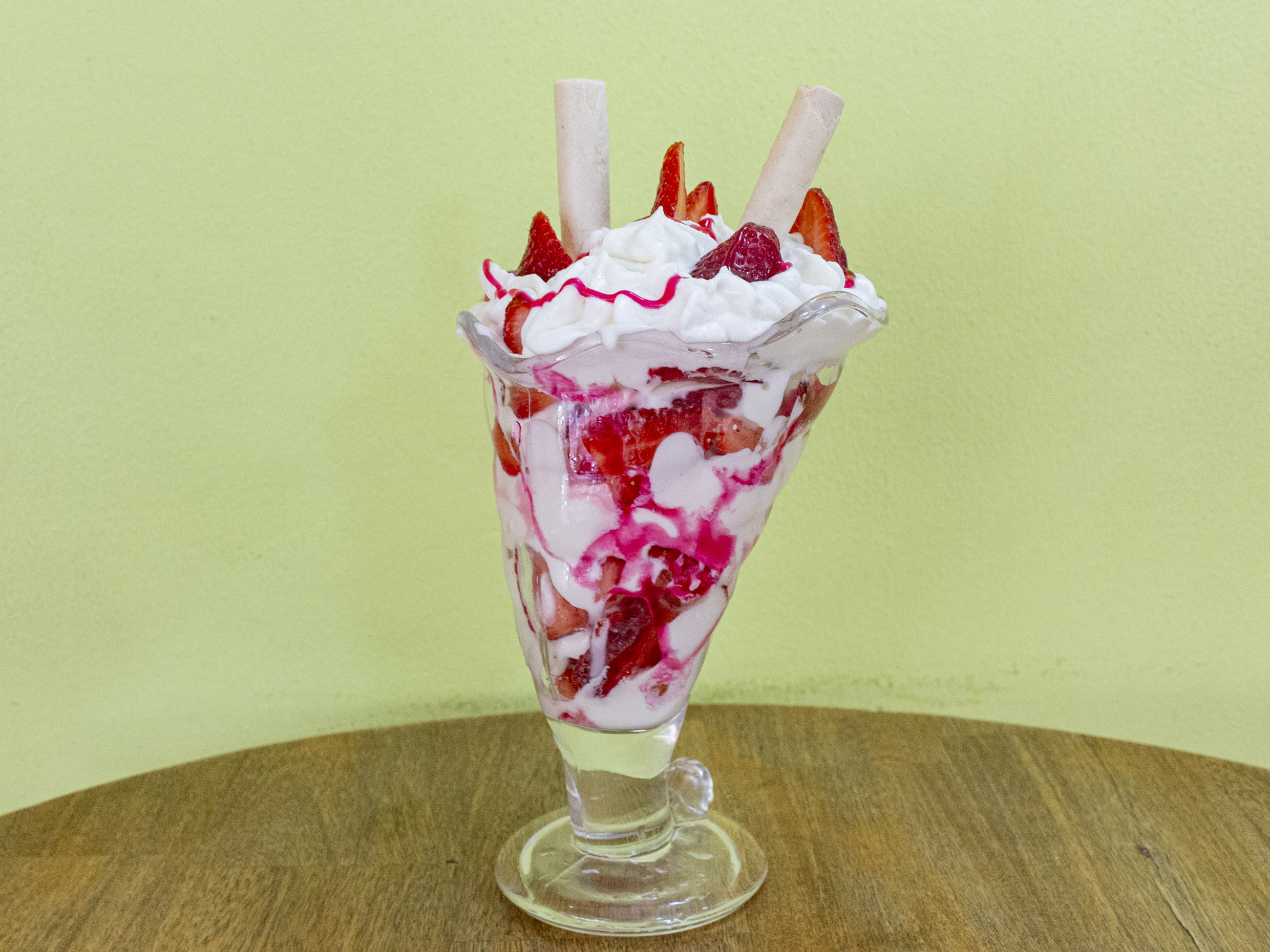 Fresas, crema mix de la casa (a base de crema de leche), helado de vainilla y chantilly.