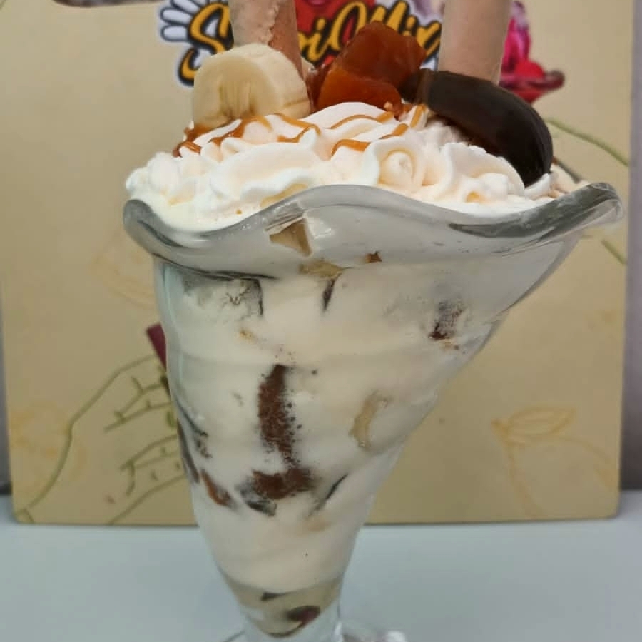salsa de arequipe , queso rallado ,trozos de banano ,helado de vainilla y arequipe ,crema de la casa y chantilly