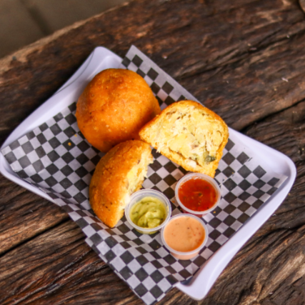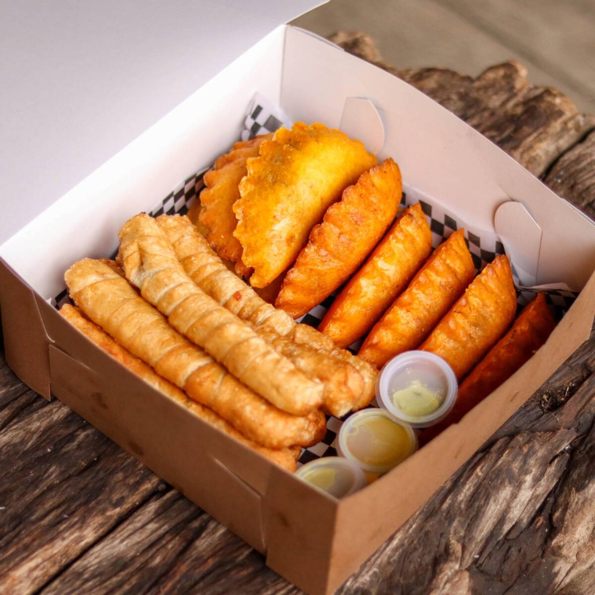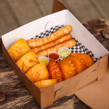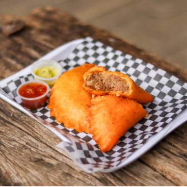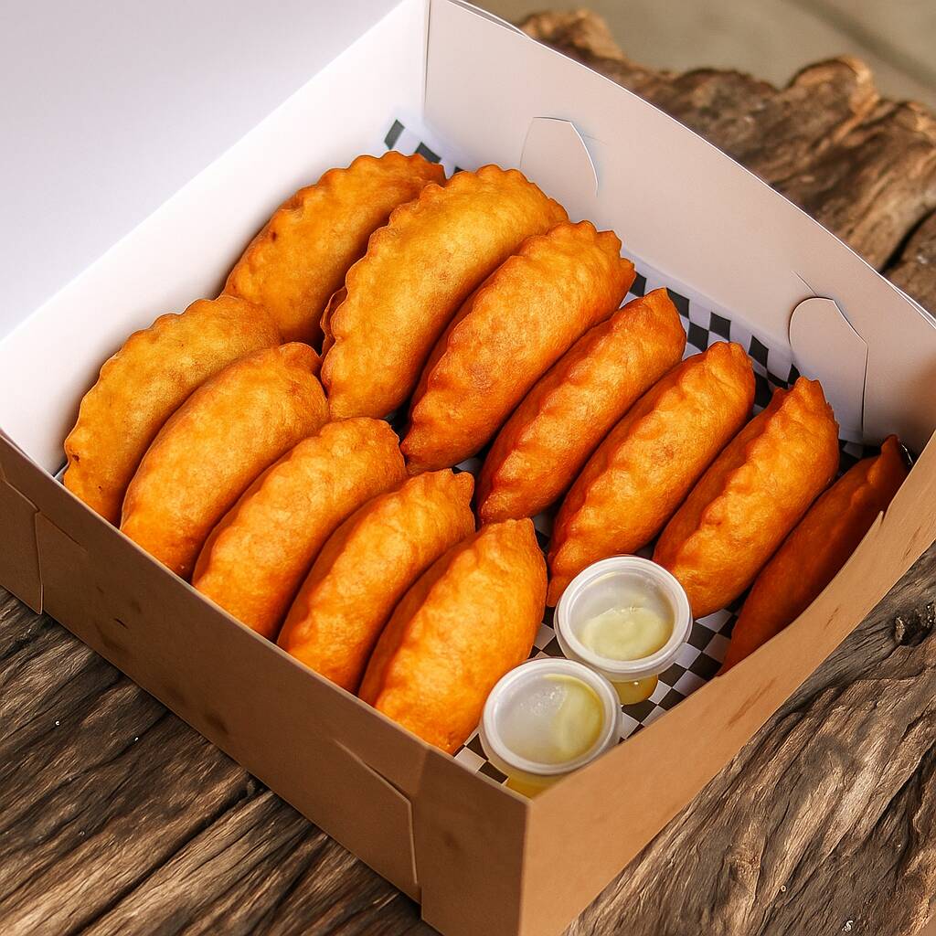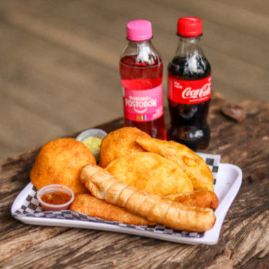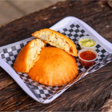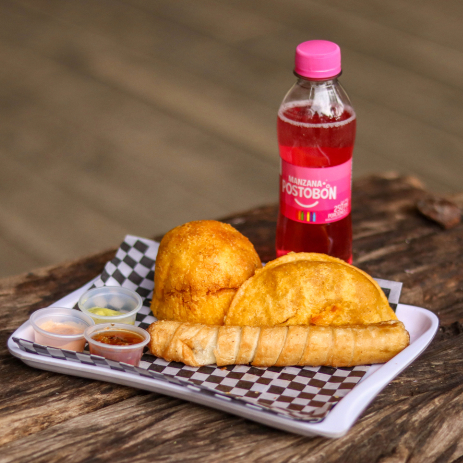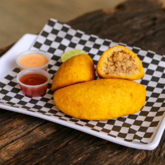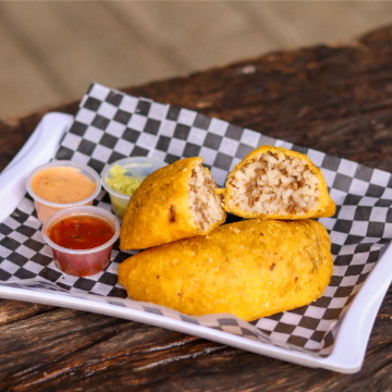 Crocante empanada de maíz de 110 g, rellena de carne y arroz, acompañada de ají dulce o picante, guacamole, salsa rosada o showy.