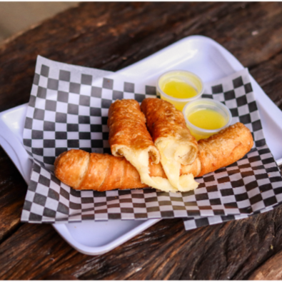 palito relleno de queso mozzarella, acompañado de mermelada de piña y mora.