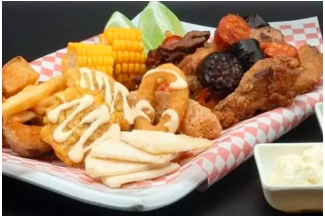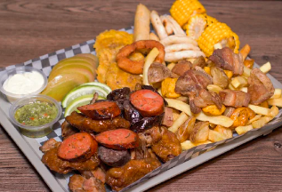 Trozos de carne de res y cerdo, chorizo y alitas (250 gr), papa casco y papa francesa (150 gr) arepa, yuca, aros de cebolla, mazorca, tomate, limón y salsa de la casa, para 2 personas.