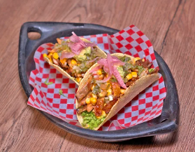 2 Tortillas de maíz crocantes con carne de res, cerdo, chicharrón, maicitos, lechuga, pico de gallo, guacamole, cebolla encurtida y salsa de la casa.