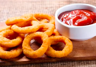 Aros de cebolla con salsa de ajo y piña, 10 pzas.