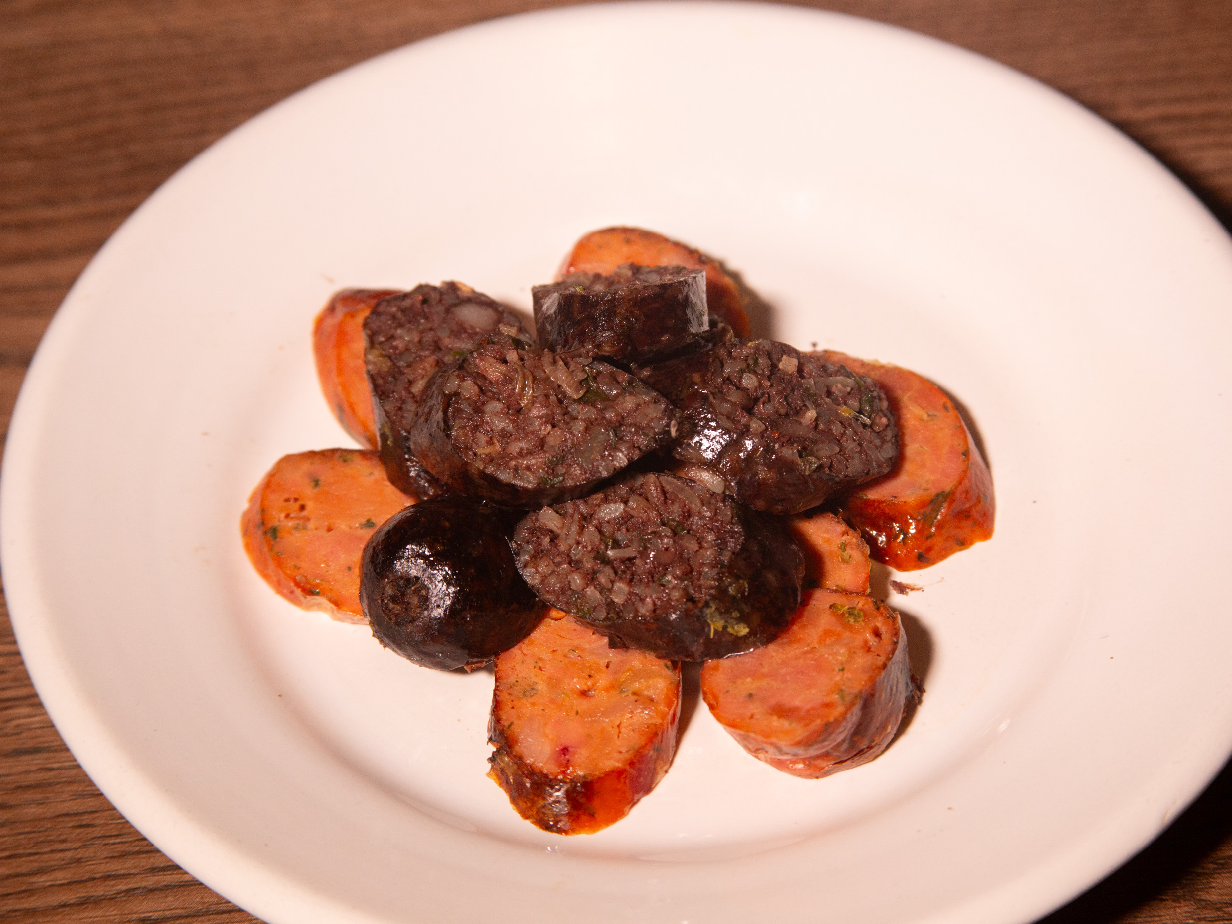 Chicharrón con chorizo, cebolla encurtida y arepa.