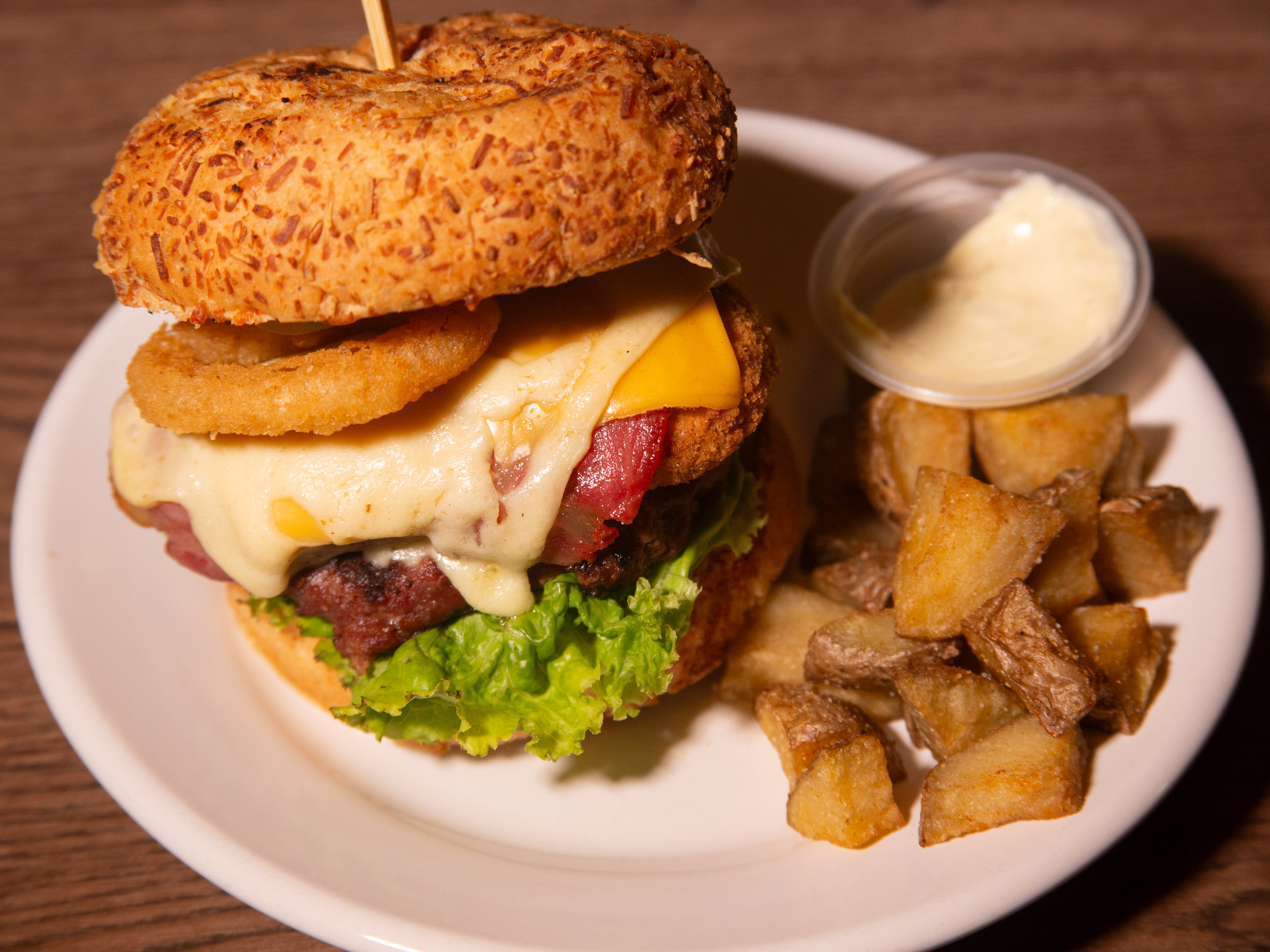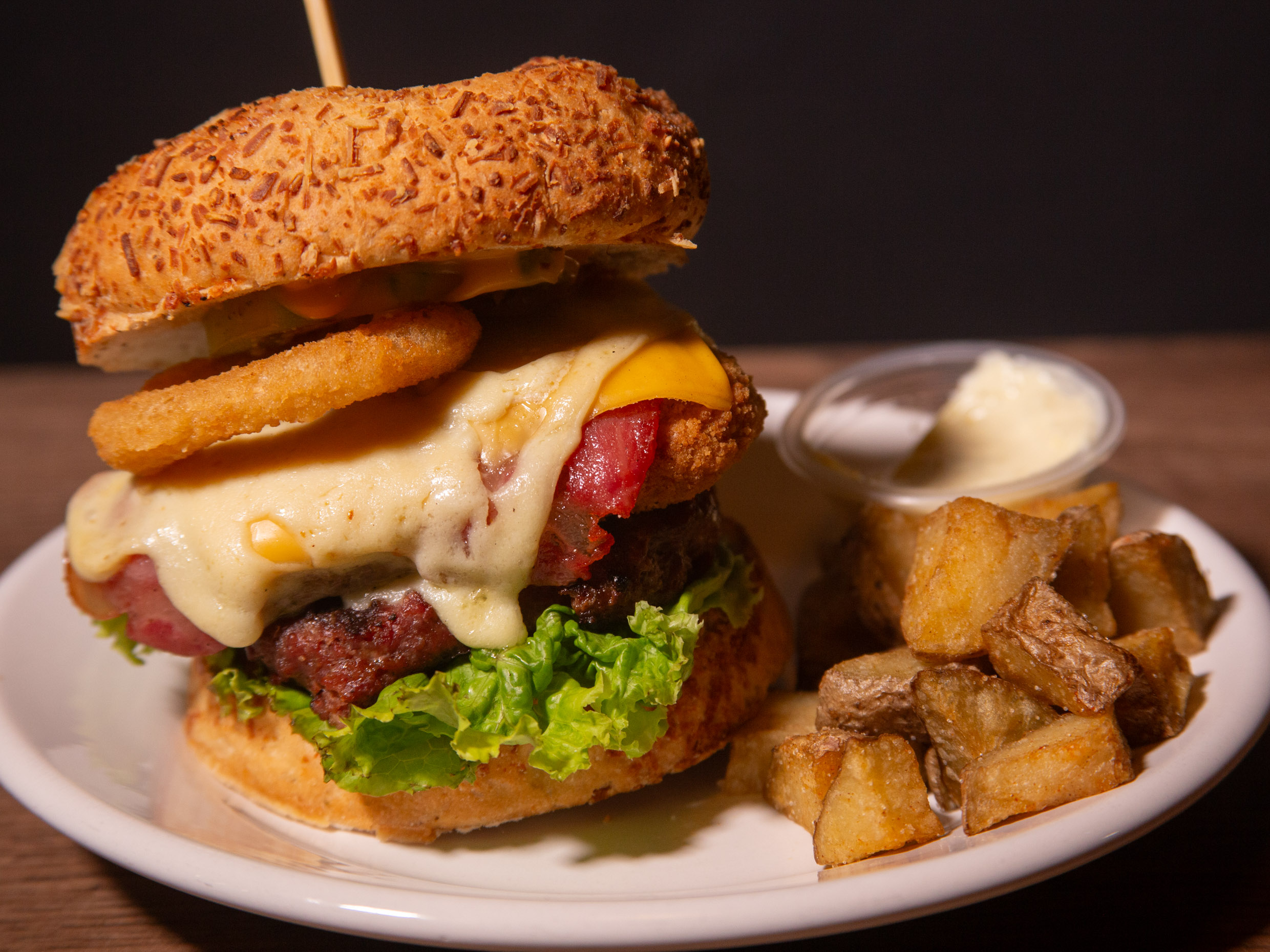 Hamburguesa de pan de orégano con parmesano, carne de res y carne de costilla ahumada 180 g, tocineta, queso mixto de la casa, aro de cebolla, pepinillos, lechuga, tomate acompañada de papas casco y salsa de la casa.