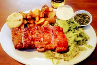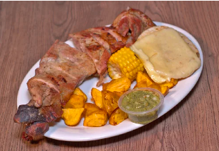 Costilla entera ahumada 800 g con papas casco, arepa, queso, mazorca y salsa de la casa.