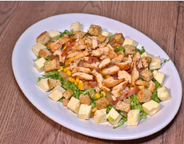 Ensalada con trozos de pollo, maicitos, queso, crutones, lechuga, tomate, pepinillos y aderezo de la casa.