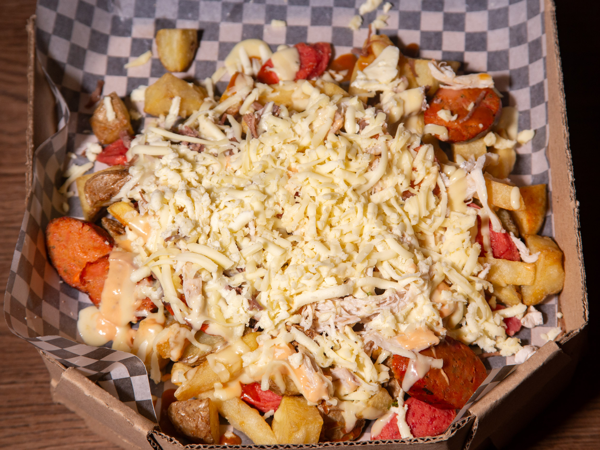 Papas casco con papas francesas, salchicha, chorizo, carne desmechada, pollo, queso rallado y salsas de la casa.