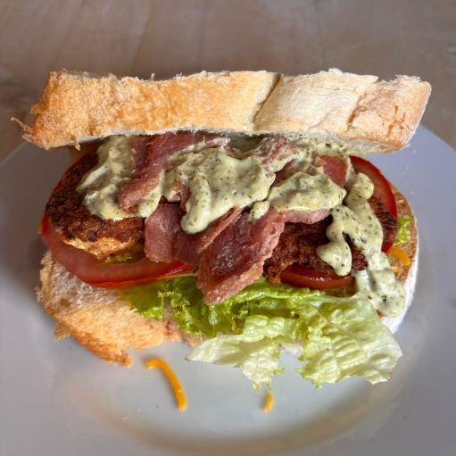 Descubre el placer de nuestro sándwich con huevo estrellado, guiso criollo de la casa, aguacate, cebolla crocante, lechuga, queso mozzarella y mayonesa casera. ¡hará que tu día sea más sabroso!.
