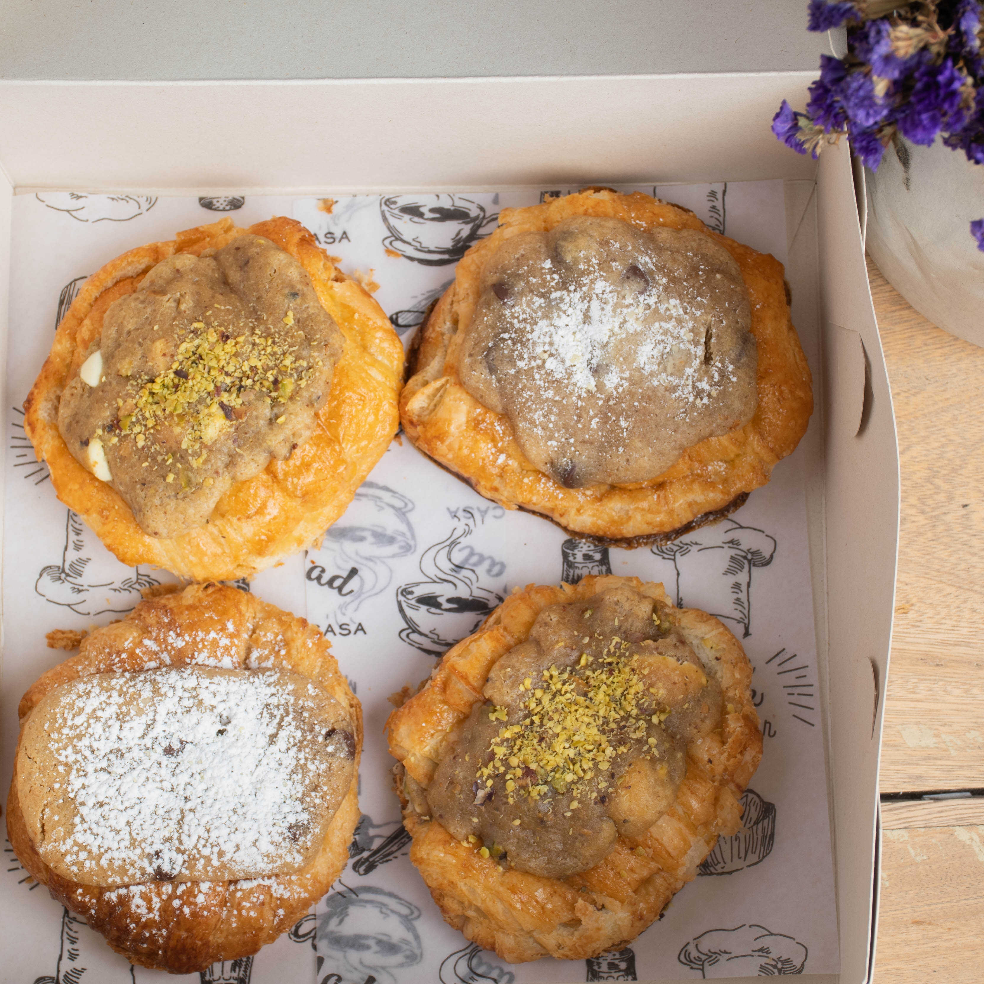 Un croissant crujiente y relleno con una galleta de chocolate blanco y pistacho, cada bocado es una explosión de texturas y sabores que te hará sonreír y querer más.