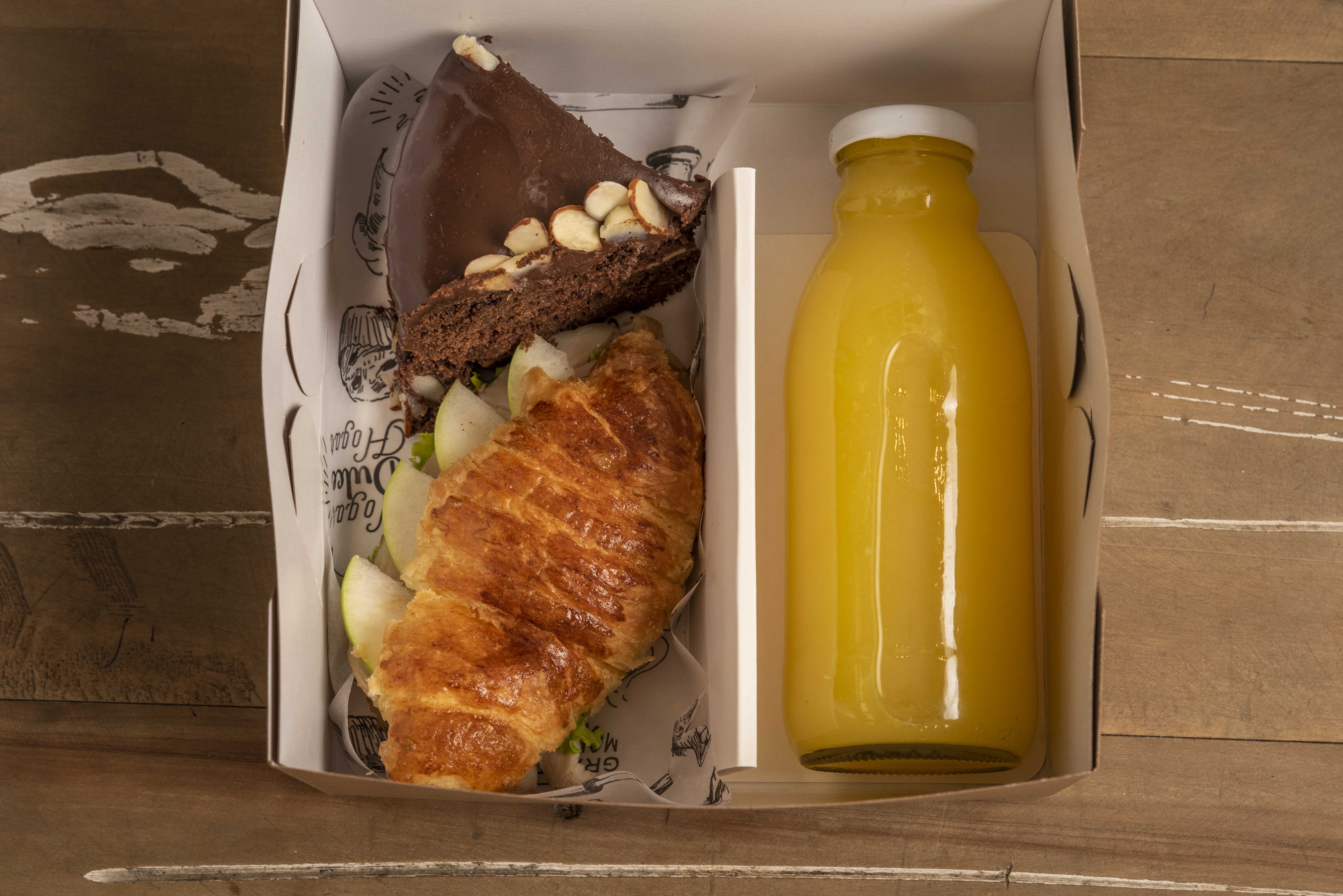 Déjate envolver por el amor con un delicioso croissant sándwich, acompañado de una exquisita torta a tu elección y el jugo que más te guste.