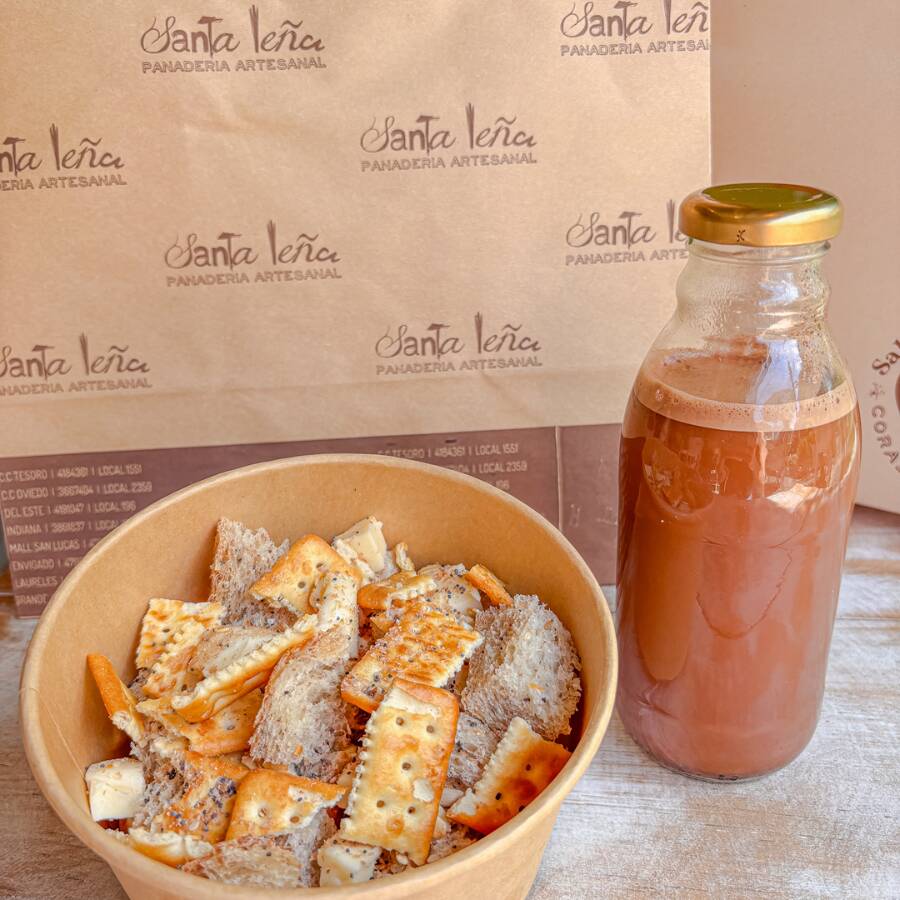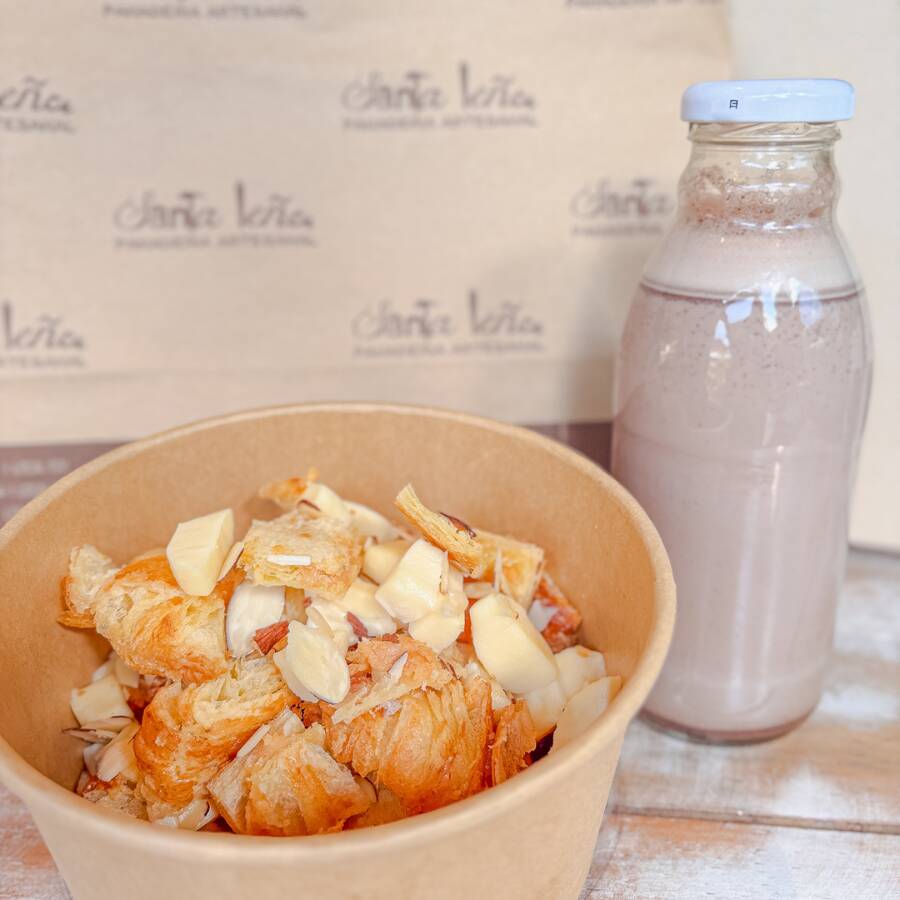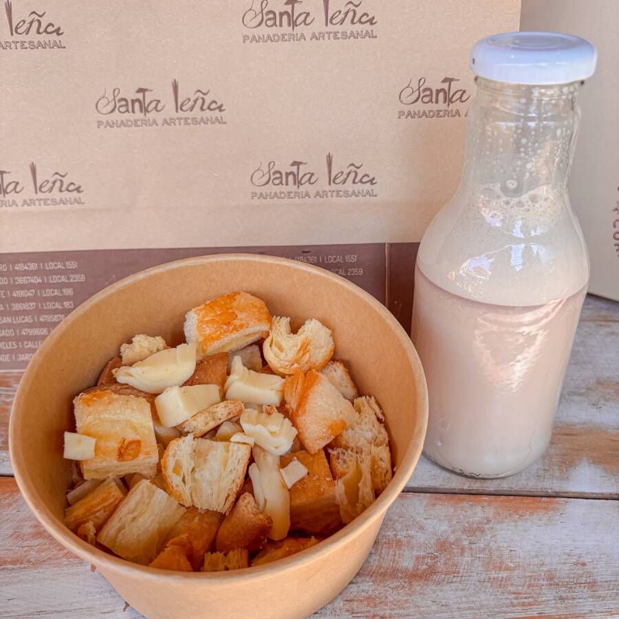 7 Tajadas de nuestros exquisitos panes artesanales de la casa de la abuela, acompañadas de un croissant a tu elección ¡perfecto para tardear con un chocolate santa leña!.