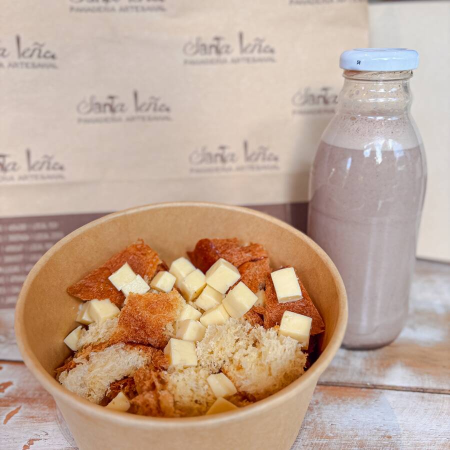 Base de pan campesino con queso momposino en chocolate santa leña y un toque de canela.