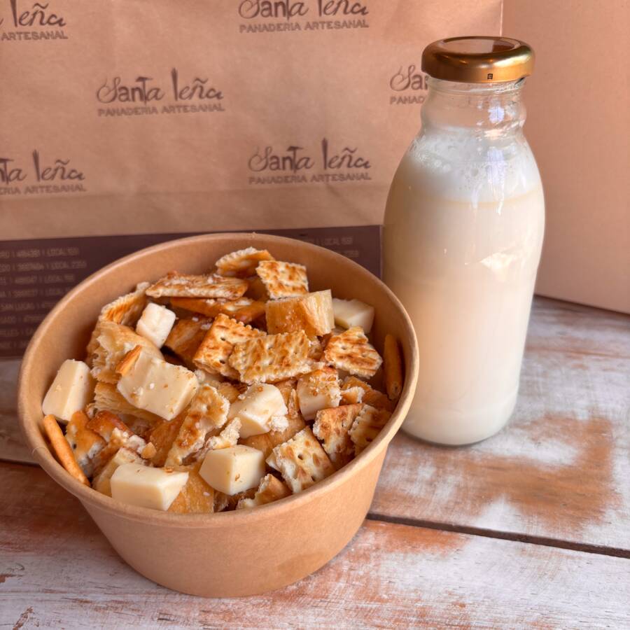 Base de milo caliente en leche, croi y galletas de mantequilla con queso momposino.