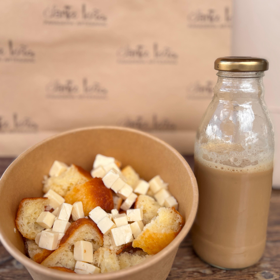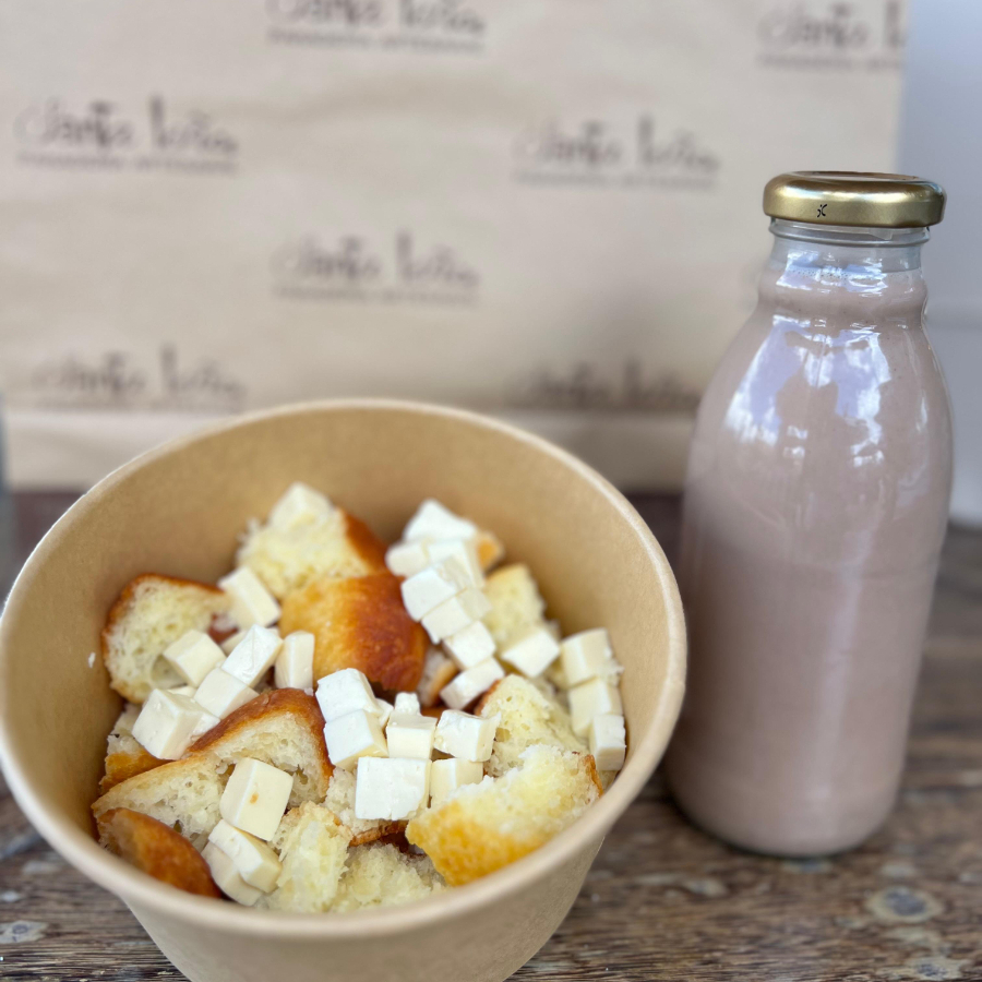 Base de pan brioche mantequilla, queso momposino, leche, en chocolate clavos y canela.