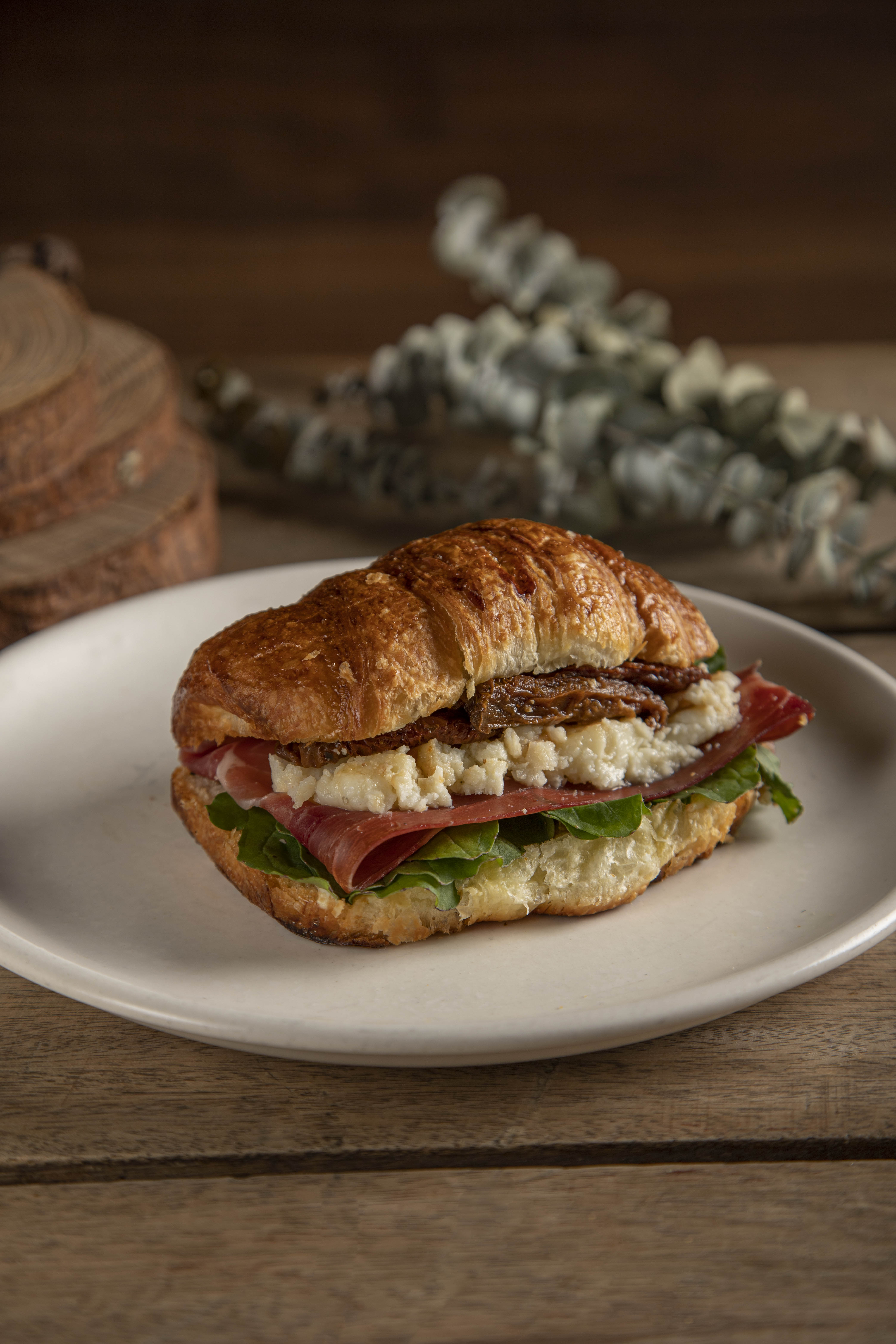 Delicioso croissant sándwich! con jamón serrano, queso mozzarella, rúcula, tomates secos, queso feta y una salsa de ajo irresistible. te recomendamos acompañarlo con un delicioso cold brew.