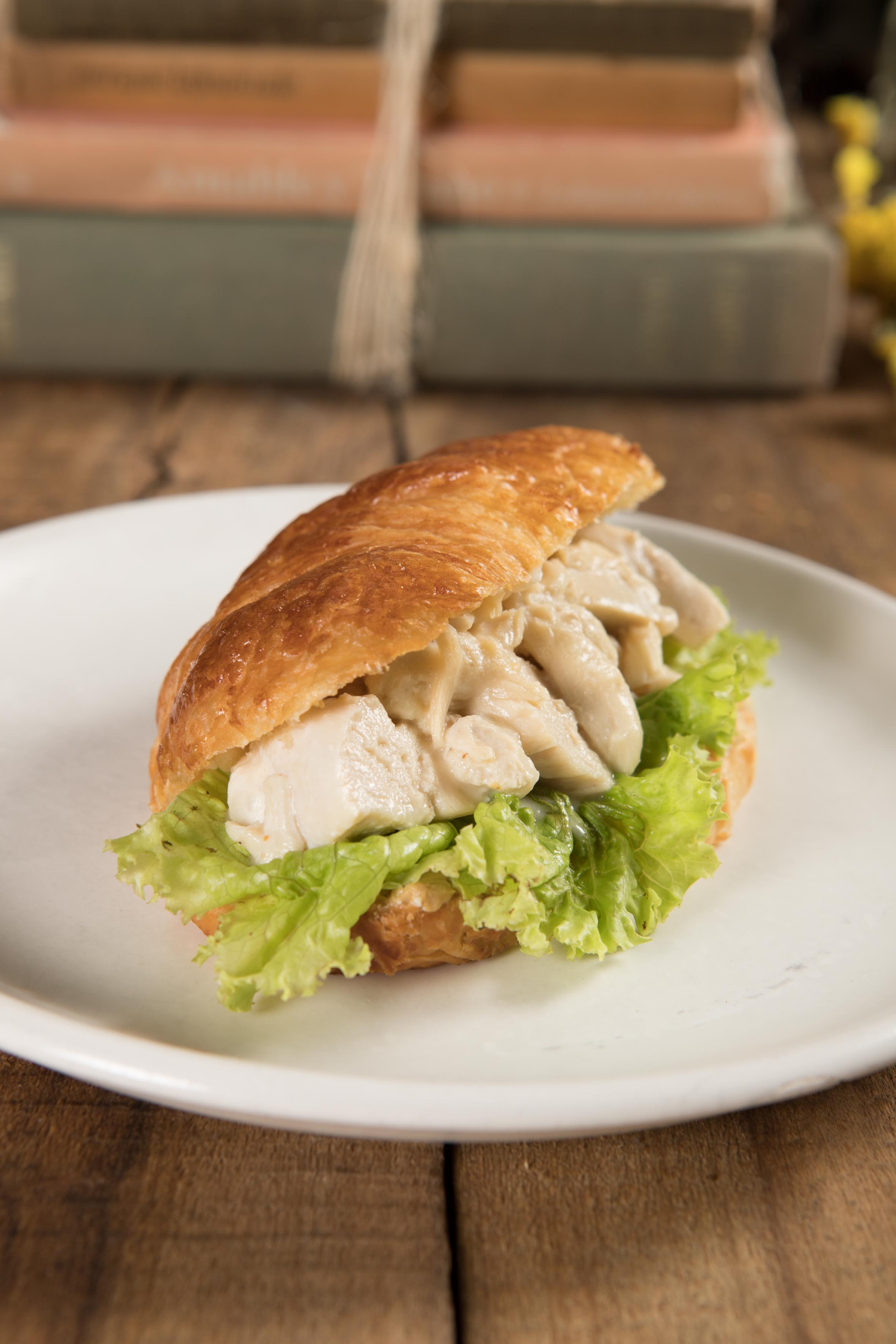 Déjate llevar por la magia de nuestro sándwich de croissant: pollo desmechado, berenjenas asadas, pepinillo encurtido, tomate, bechamel, lechuga, cebolla crocante y una mayonesa de cilantro y ajo.