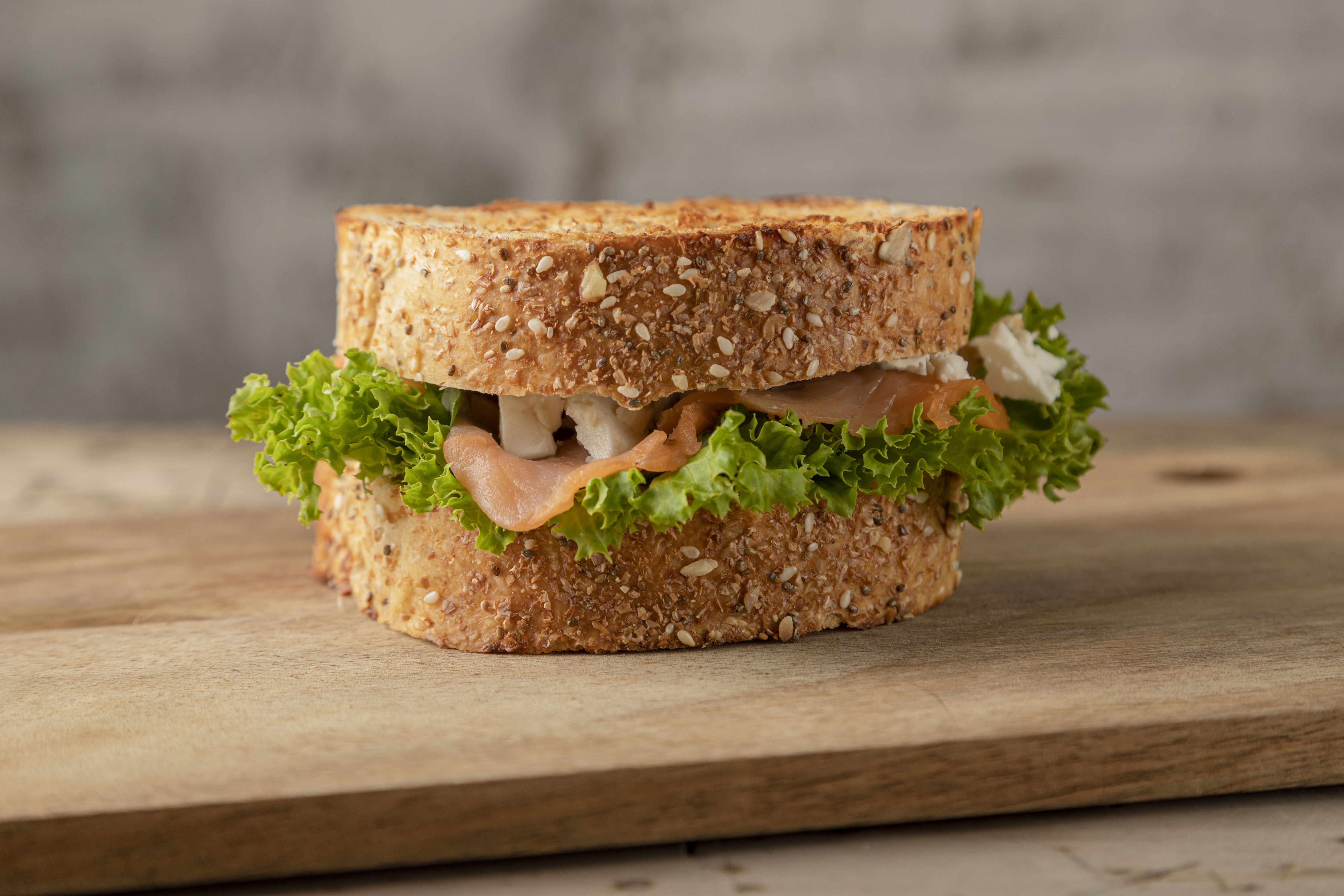 Exquisito sándwich con salmón ahumado, queso feta, queso philadelphia, lechuga crespa y rúcula. ¡una combinación perfecta para los amantes del salmón!.