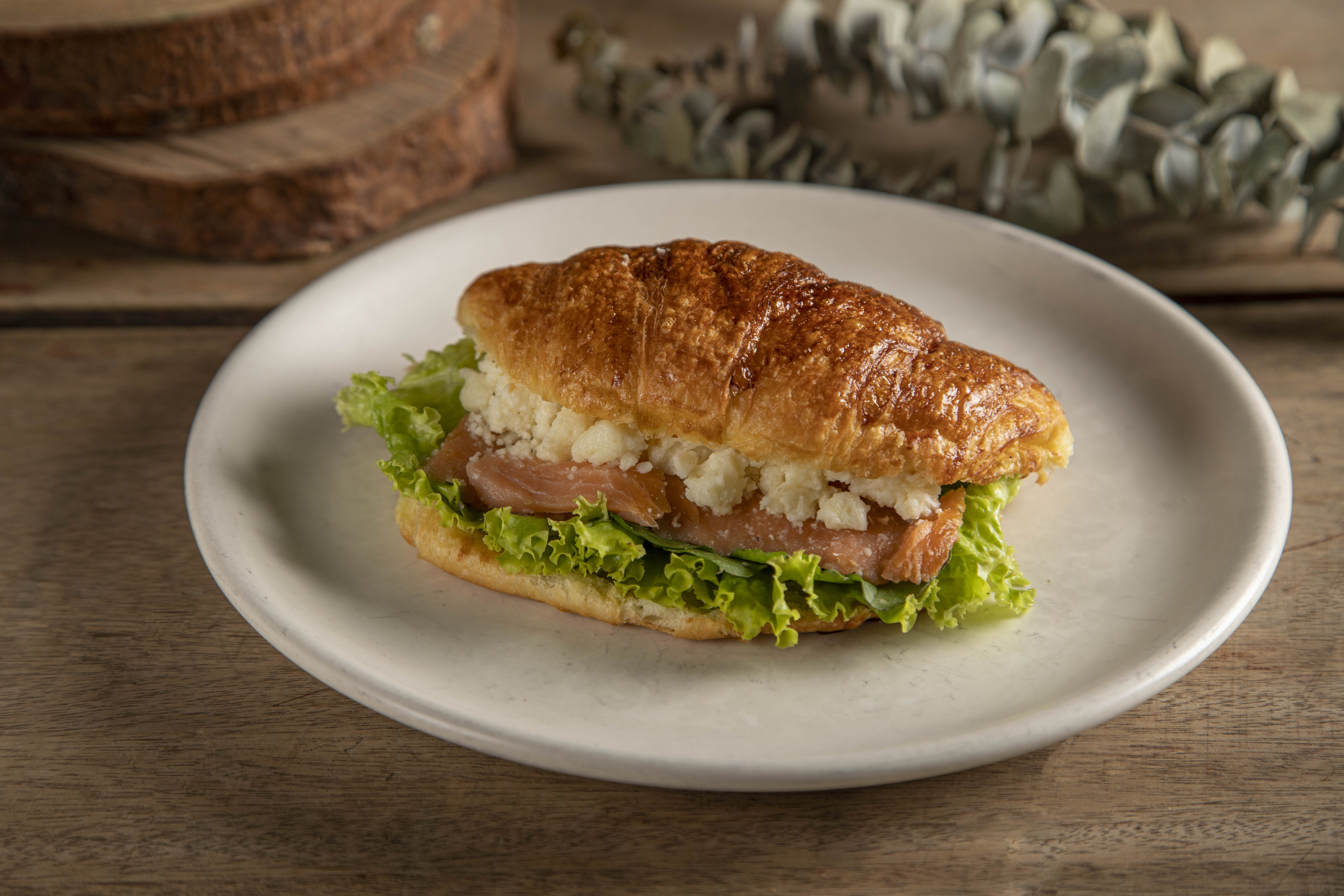 Déjate tentar por nuestro sándwich de croissant con salmón ahumado, queso feta, queso philadelphia, lechuga crespa y rúcula. ¡perfecto con un delicioso batido antioxidante!.