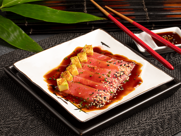 Láminas de atún fresco bañadas en una salsa cítrica y soya, con toques de ajonjolí, jengibre y togarashi. Una explosión de umami, frescura y picante suave.