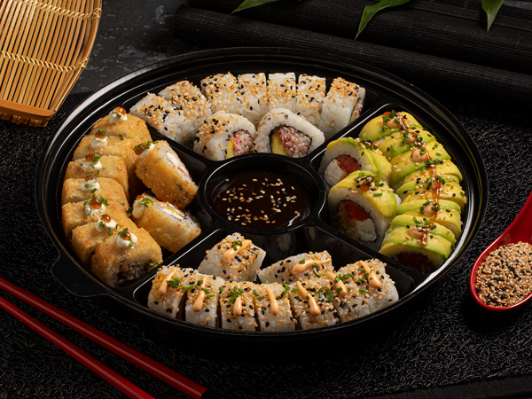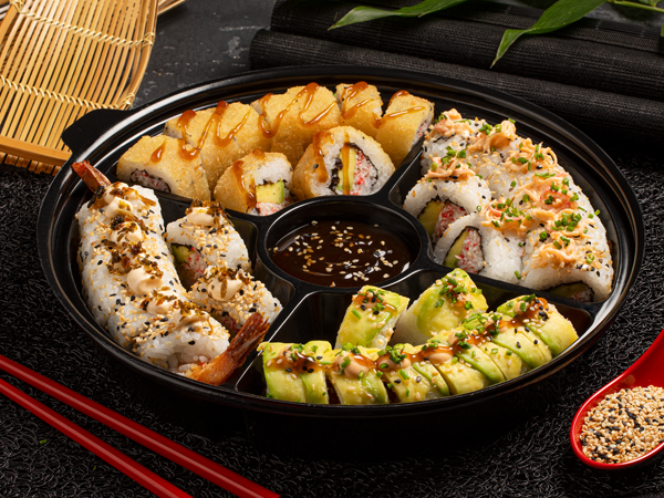 Vegetales frescos, 2 piezas de Sushi California ó 2 piezas de Sushi Golden California ó 1 maki roll, arroz japonés o pasta y pollo teriyaki o mandariyaki