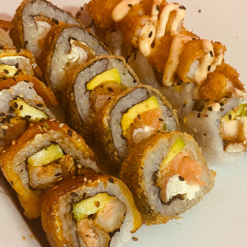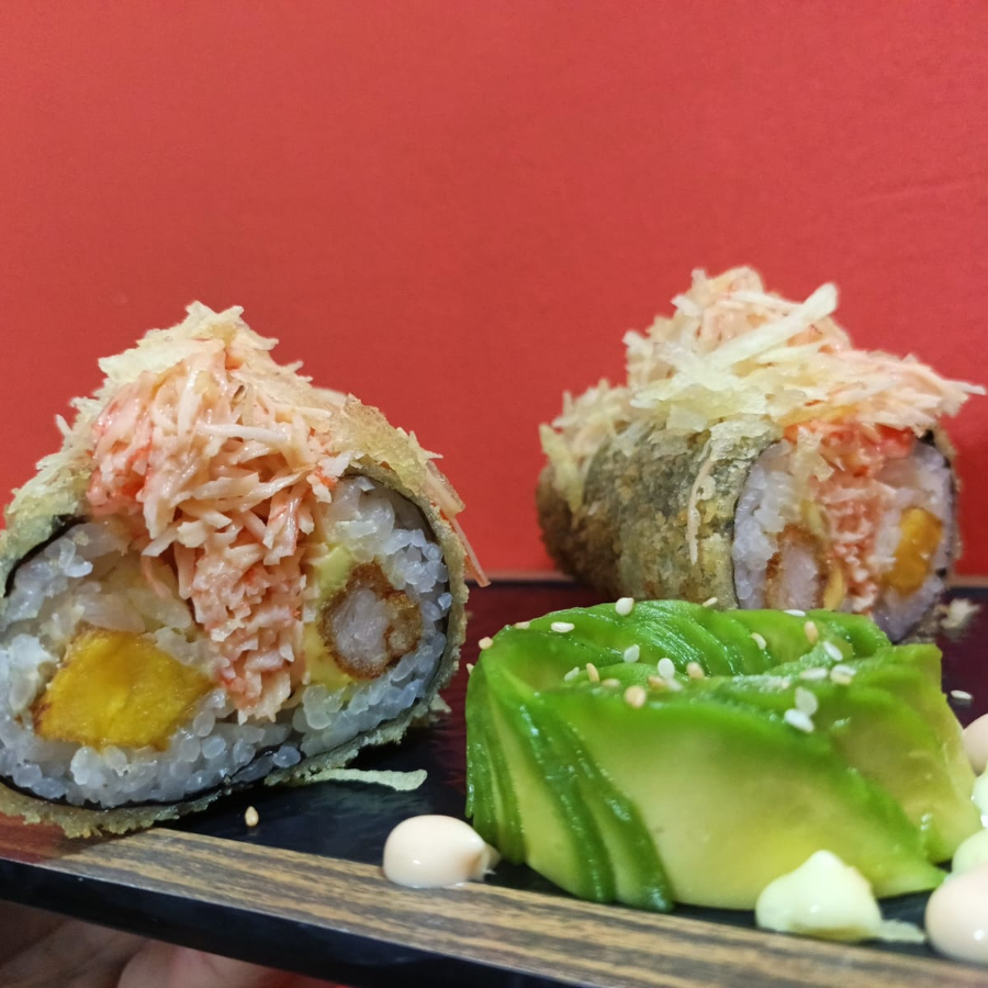 sushi,queso crema,platano,aguacate,camarones,topping,dinamita,yuca crocante,salsa mayo siracha