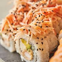 En su interior con langostino crocante, aguacate y philadelphia, coronado con cremosa de kani, algas, masago en mayonesa japonesa.