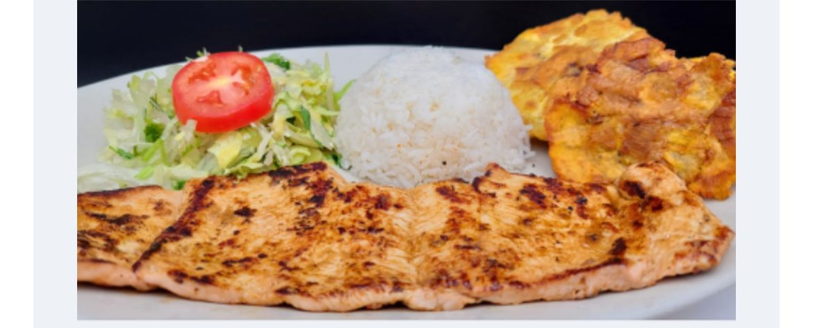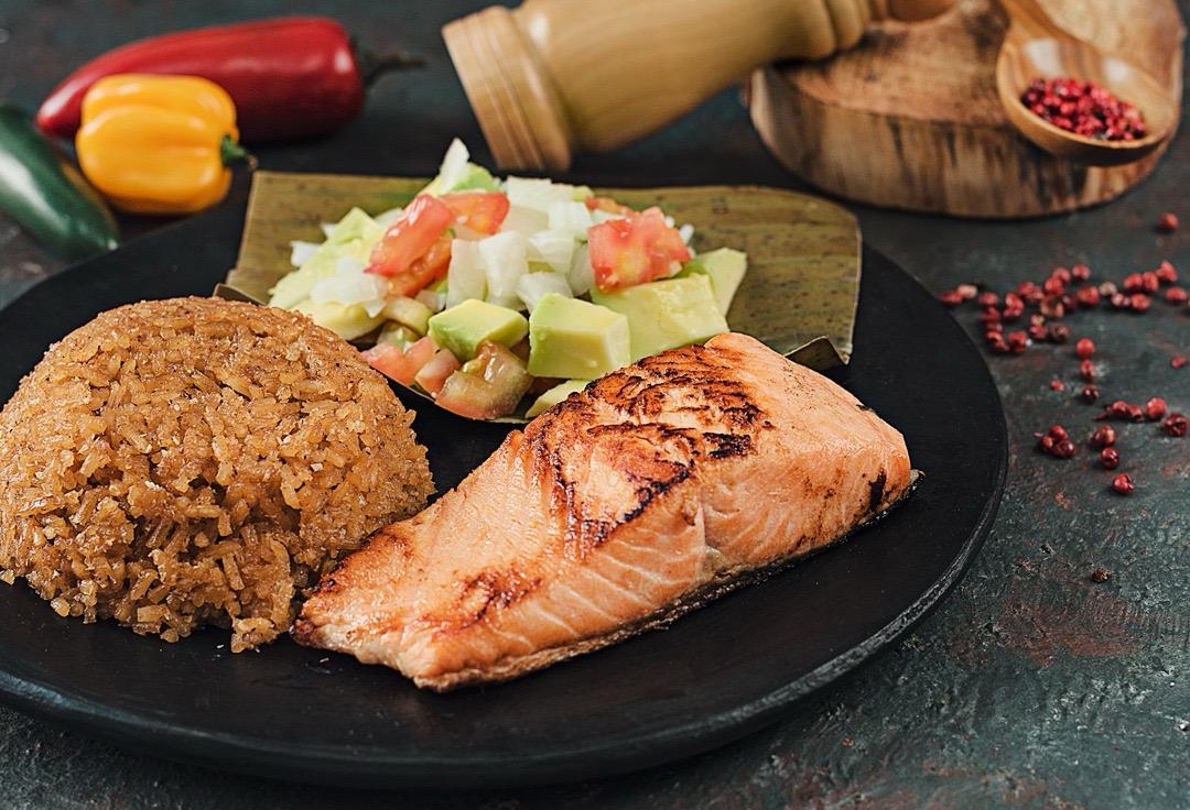 Salmón a la plancha, acompañada con arroz blanco o arroz de coco, patacón, ensalada, aguacate y consomé de pescado.