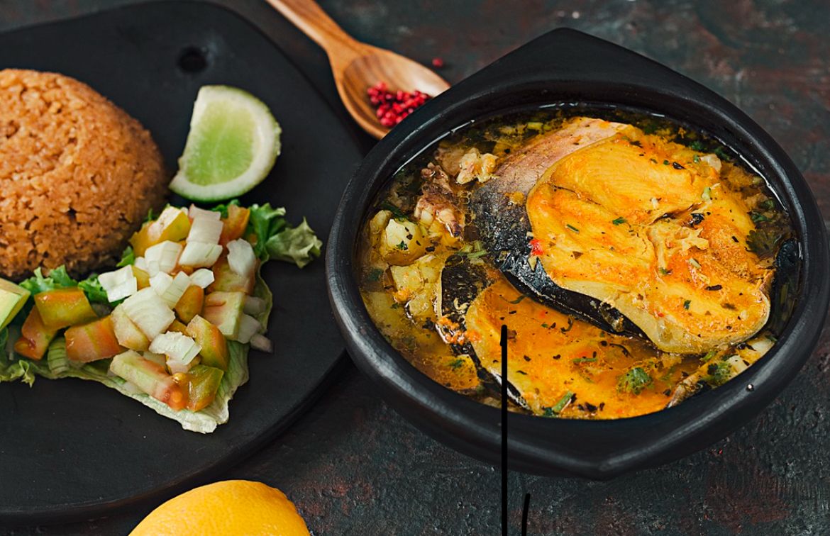 Sancocho de bagre, acompañado con arroz blanco o arroz de coco, patacón, ensalada y aguacate.Sancocho de bagre, acompañado con arroz blanco o arroz de coco, patacón, ensalada y aguacate.