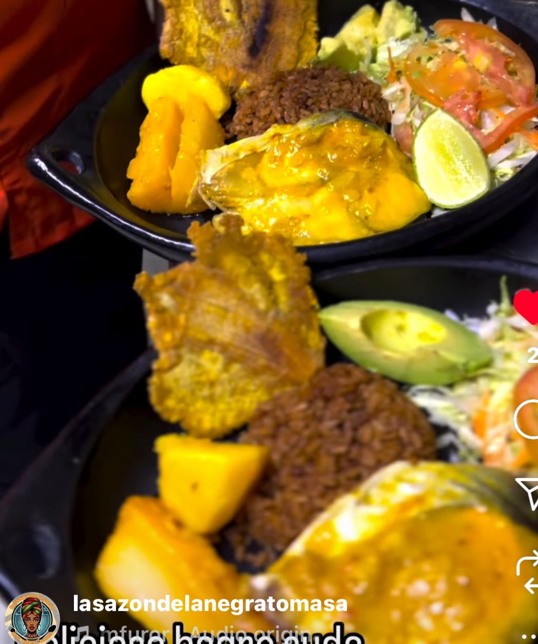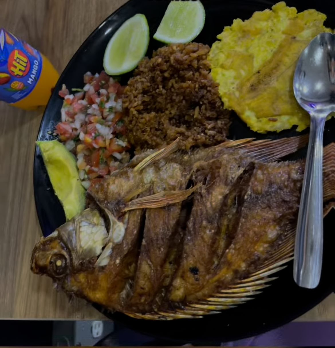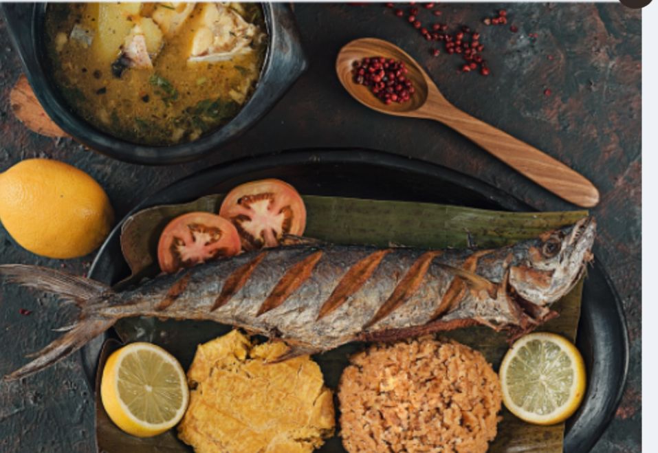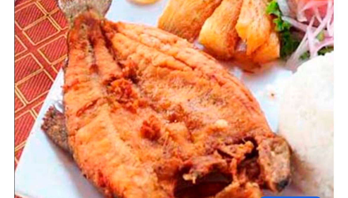 Tilapia frita, acompañada con arroz blanco o arroz de coco, patacón, ensalada, aguacate y consomé de pescado.